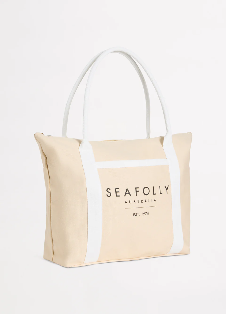 Пляжная сумка-тоут Сифолли светло-бежевого, песочного цвета - Seafolly Canvas Tote Bag 72108-BG sand. 100% хлопок, текстильное полотно с текстурой холст. Прямоугольная форма, узкие ручки белого цвета. Двойные ручки достаточно длинные - сумку можно носить на плече. Застегивается на золотистую молнию. Впереди - внешний карман. Длина сумки - 52 см. Материал однослойный, без подкладки. Сумка украшена фирменной эмблемой Seafolly Australia