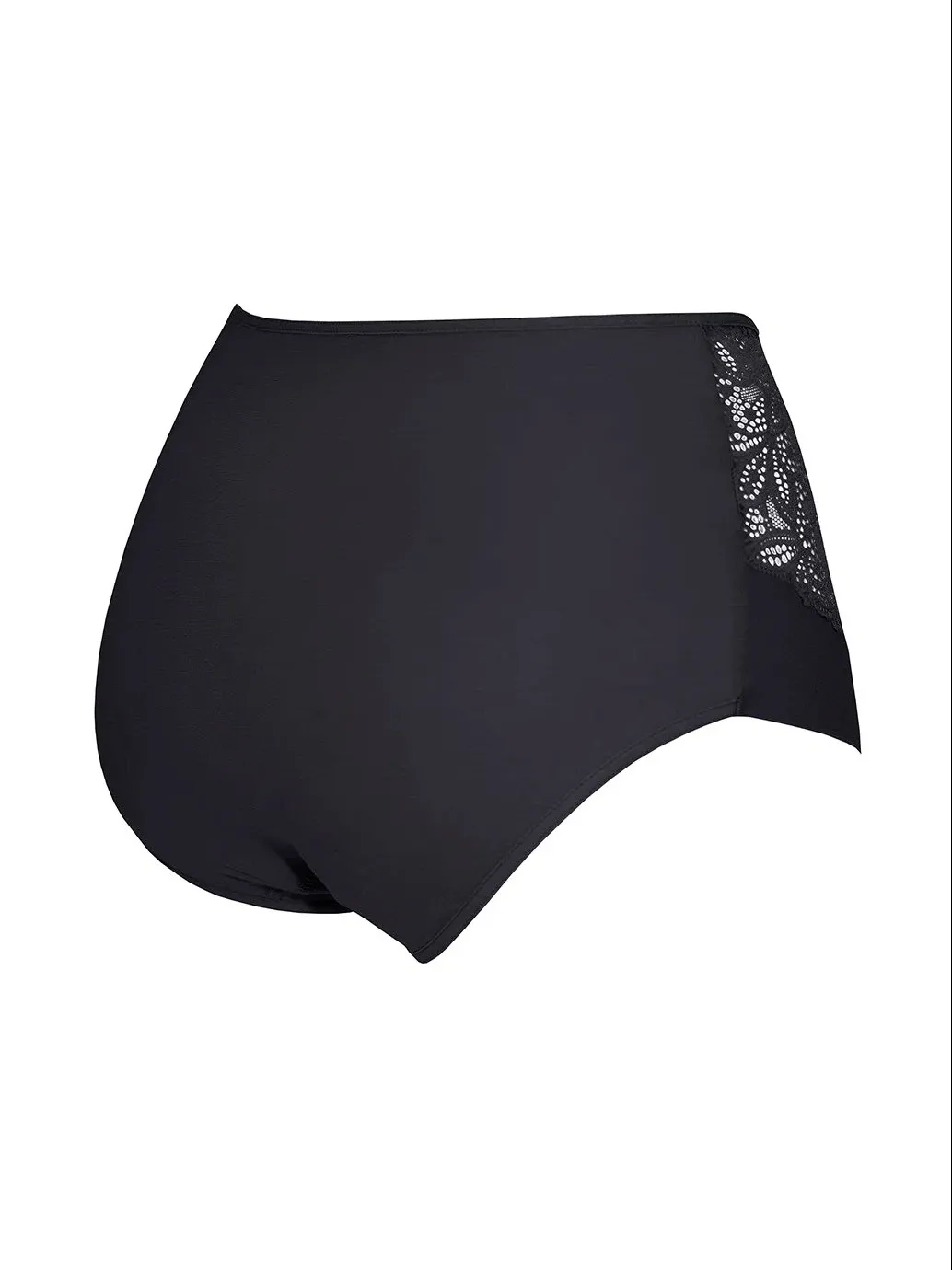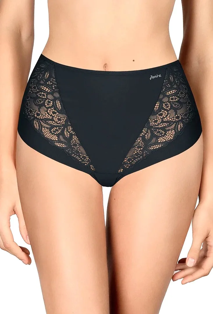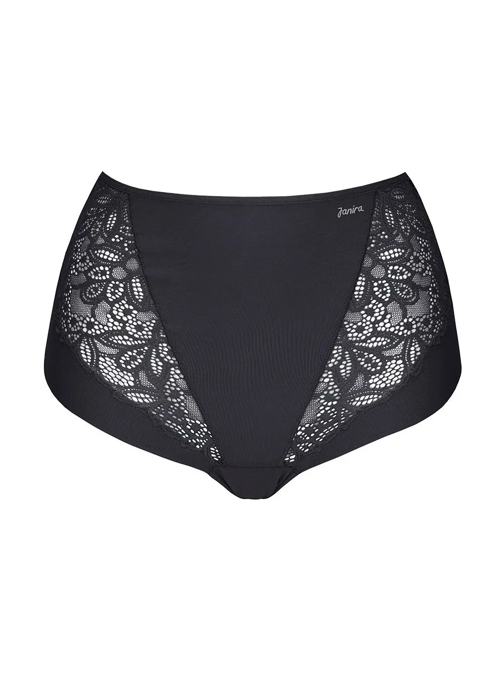 Высокие трусы Джанира Белль Коттон черного цвета, с тонким полупрозрачным кружевом - Janira Belle Cotton 1032307 002 negro (32307). Ластовица из мелкой хлопковой гипоаллегренной махры. Плоские швы, края изделия - сгиб сложенной вдвое ткани, комфортный, незаметный. Вырез ног сзади окантован тонкой эластичной кромкой.