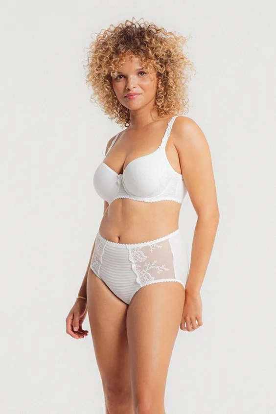Высокие трусы Луиза Брак Элис белого цвета - Louisa Bracq Elise full brief rouge baiser 419 50 blanc BLC. Впереди текстурированная ткань в рубчик сочетается со вставками из прозрачного кружева с вышивкой. Сзади - гладкая матовая ткань и вышитый логотип LB. Линия талии и вырез ног с эластичной окантовкой. Завышенная талия сглаживает силуэт живота.