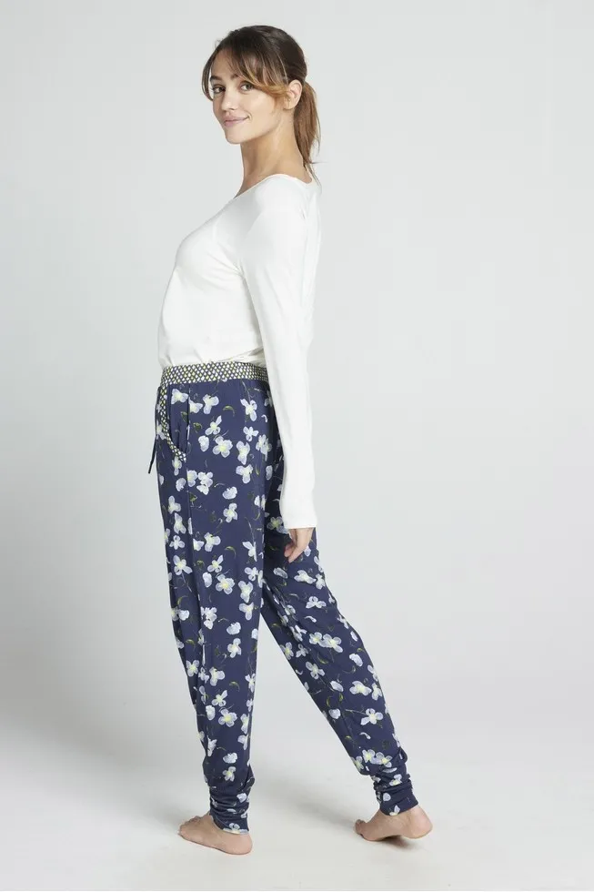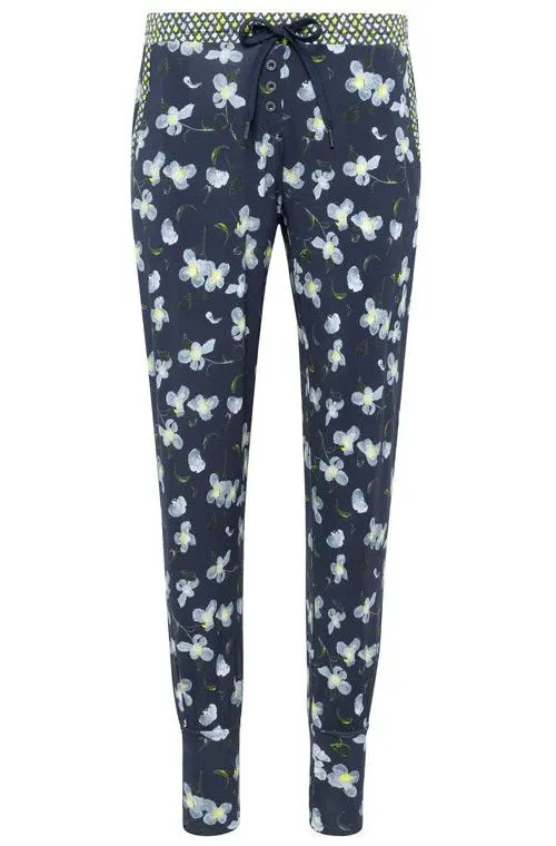 Женские брюки Жокей Софт с флористическим принтом на тёмно-синем фоне, из трикотажного модала 95%, эластан 5% - Jockey® Soft 8508222 - 463 Dark Iris. Широкий эластичный пояс со шнурком для фиксации объема контрастного лимонно-синего цвета. Брюки заужены к низу, внизу на широких манжетах. Впереди декоративная застежка на пуговицы. Боковые карманы.