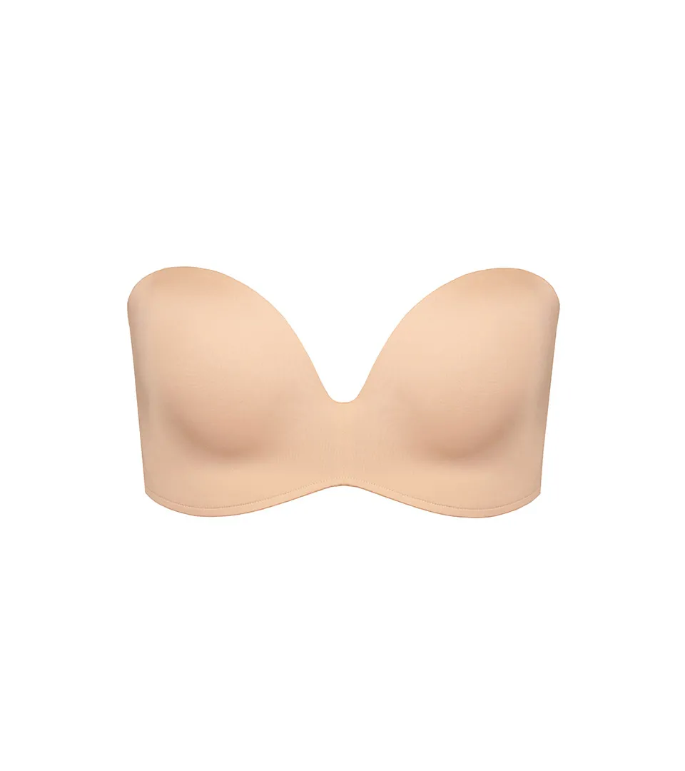 Пуш ап бюстгальтер без бретелей Вандербра телесно-бежевого цвета Ultimate Strapless® Ultimate Silhouette - W032D Skin 007. Чашка на боковых косточках, по нижнему краю косточек нет. Поддержка осуществляется за счет уплотнения внутри чашки снизу (у основания) и с боку - четырехпальцевая система поддержки - инновационная разработка Wonderbra. Хорошо поднимает грудь и обеспечивает оптимальную поддержку.