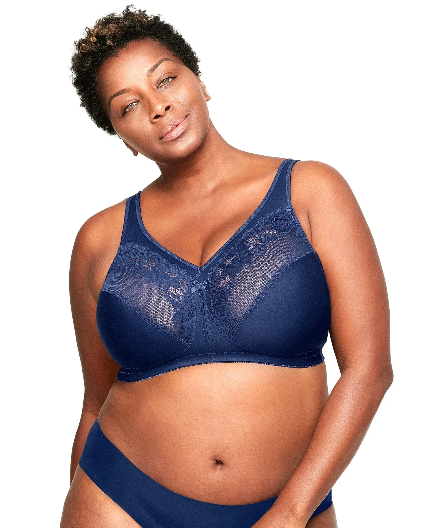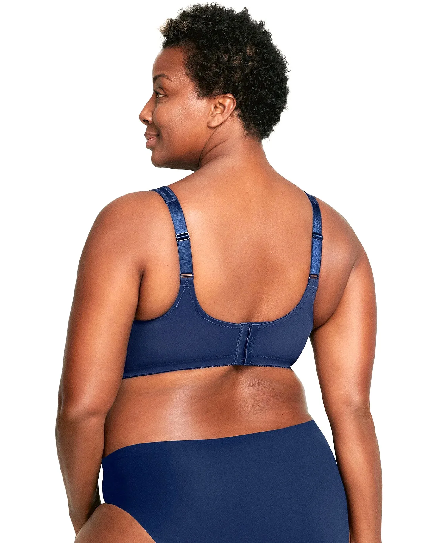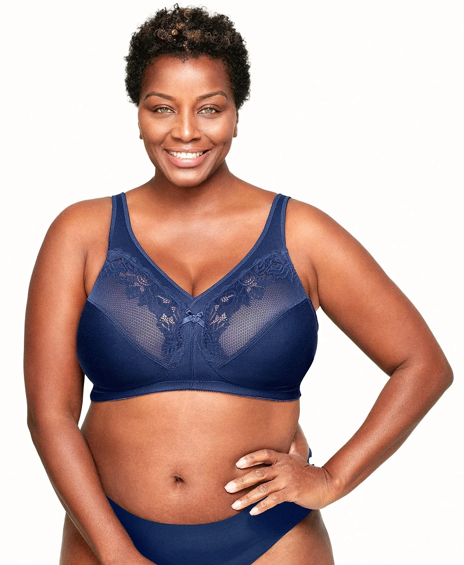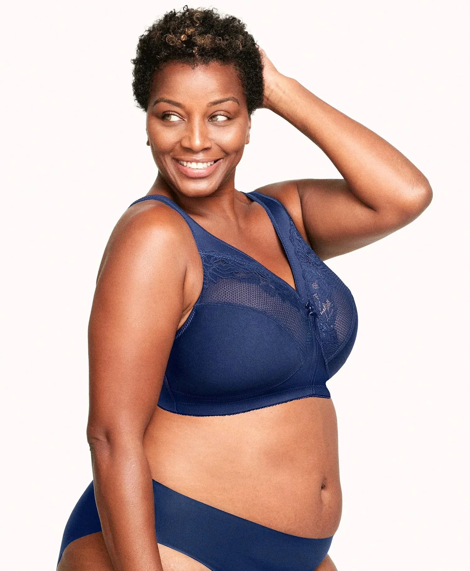 Бюстгальтер-минимайзер Glamorise большого размера без косточек, темно-синего цвета. Комфортная бескаркасная поддержка, снижение нагрузки на плечи и позвоночник! Бюстгальтер сконструирован по запатентованной технологии MagicLift.
