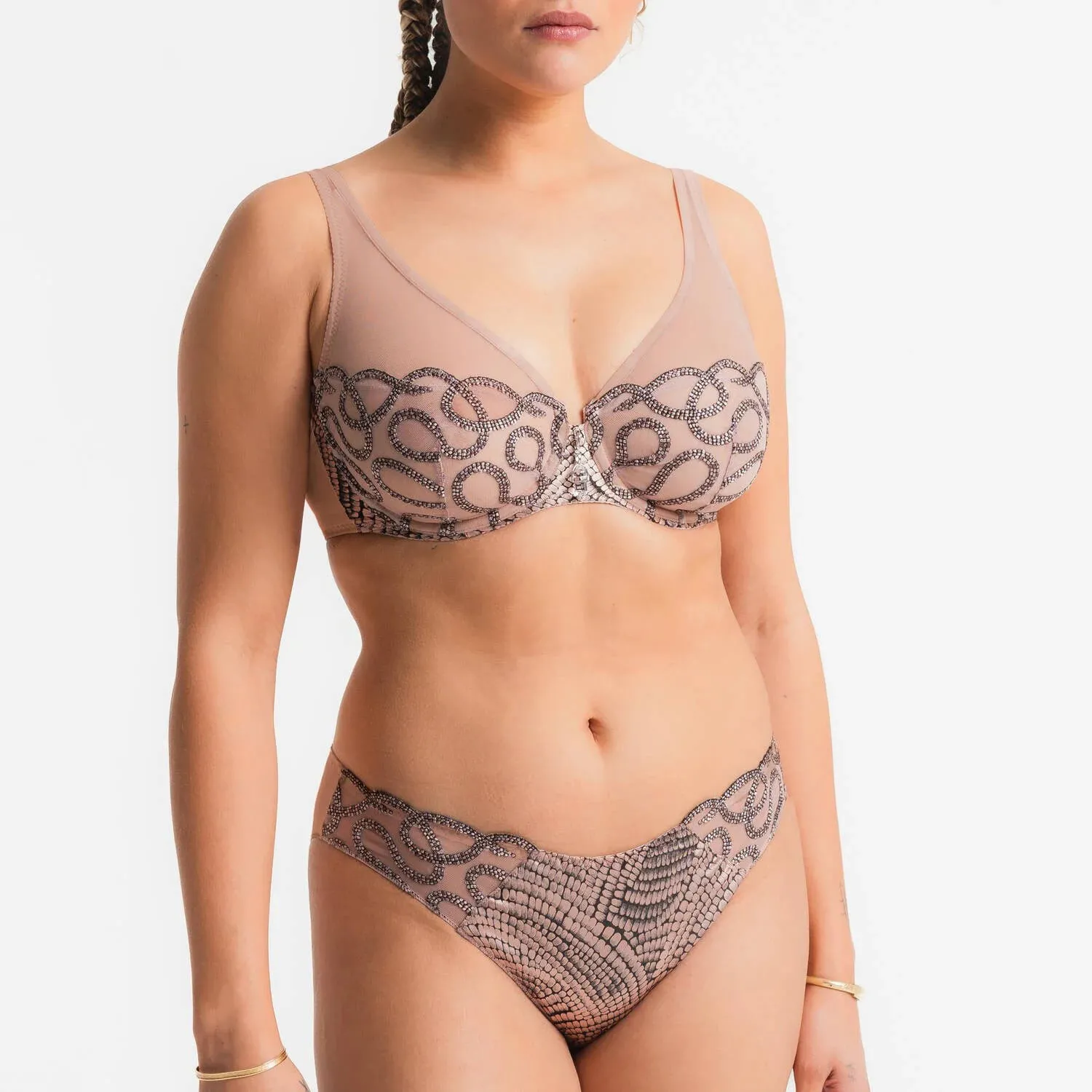Бюстгальтер-платок Луиза Брак с принтом Рептилия розово-бежевого цвета - Louisa Bracq Divine SG Foulard Bra 482 50 STL. Красивое сочетание шелковистой непрозрачной ткани с жаккардовой фактурой и кружева с перламутровой мозаичной вышивкой и змеевидным узором. 3% натурального шёлка в составе.