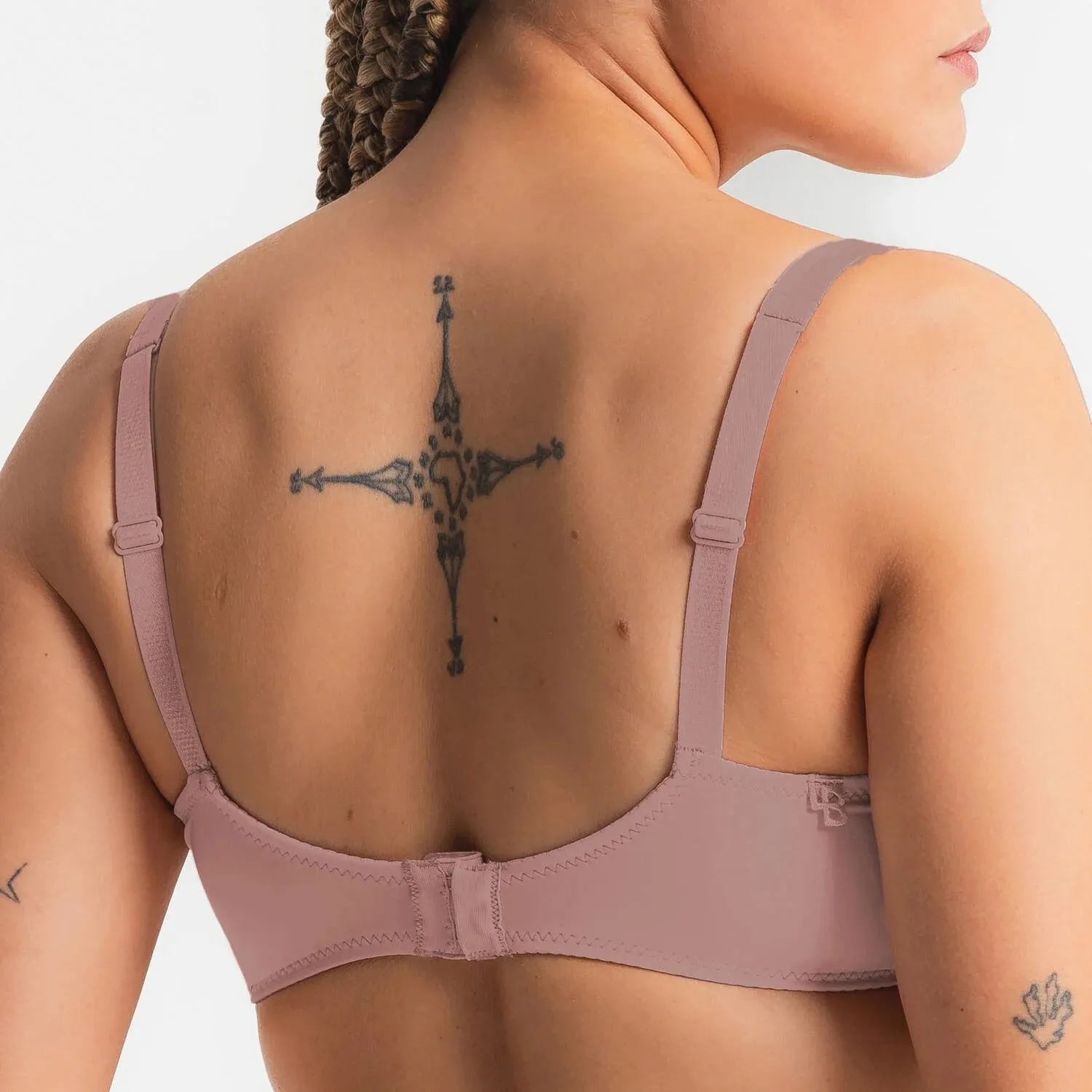 Мягкая, закрытая чашка на высоких косточках. Нижняя часть бюстгальтера напоминает балконет - высокая центральная арка и высокие косточки, хорошо обхватывают и поддерживают грудь. Вертикальный шов обеспечивает подъем. Верхняя часть чашки выполнена из тонкого, прозрачного тюля, сглаживающего силуэт. По краю чашки проходит эластичная окантовка. Между чашками - красивое золотистое украшение. Бретели являются продолжением треугольной чашки, регулировка длины на пластиковой фурнитуре.
