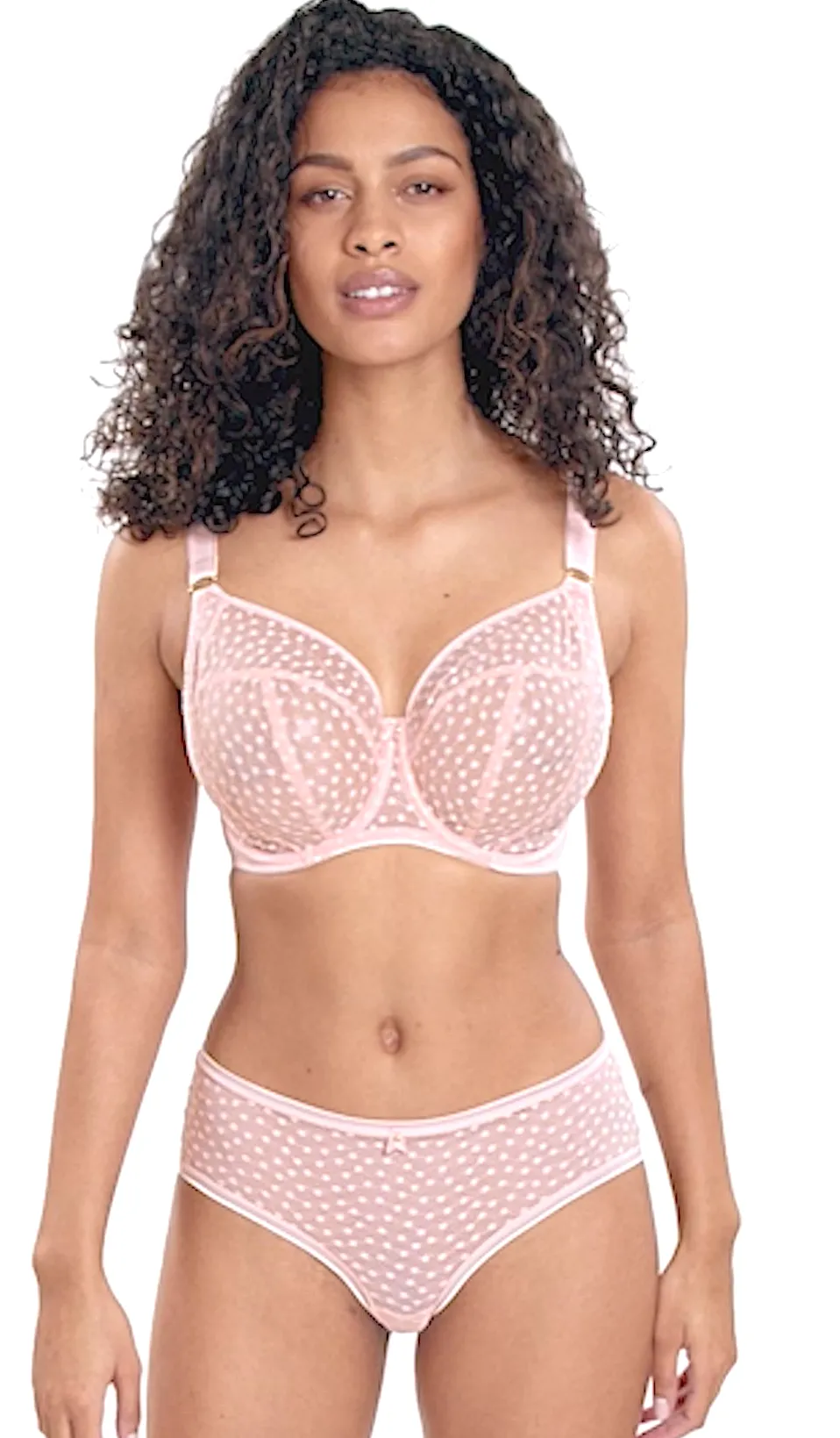 Кружевной бюстгальтер для очень большой груди Фрея Старлайт нежно-розового цвета Розовая вода - Freya Starlight UW HERO BALCONY SIDE SUPPORT BRA 5202 ROR rosewater. Выполнен из эффектной полупрозрачной кружевной ткани в горошек. Мягкая чашка на косточках с боковыми поддерживающими панелями. Чашка скроена из 4 частей. Такой крой хорошо поднимает грудь и направляет ее вперед, поддерживает красивую форму. Естественная форма груди поддерживается композицией из вертикального и диагонального швов. По верхнему краю чашки проходит эластичная лента для максимально полного прилегания к телу и создания ровного силуэта.