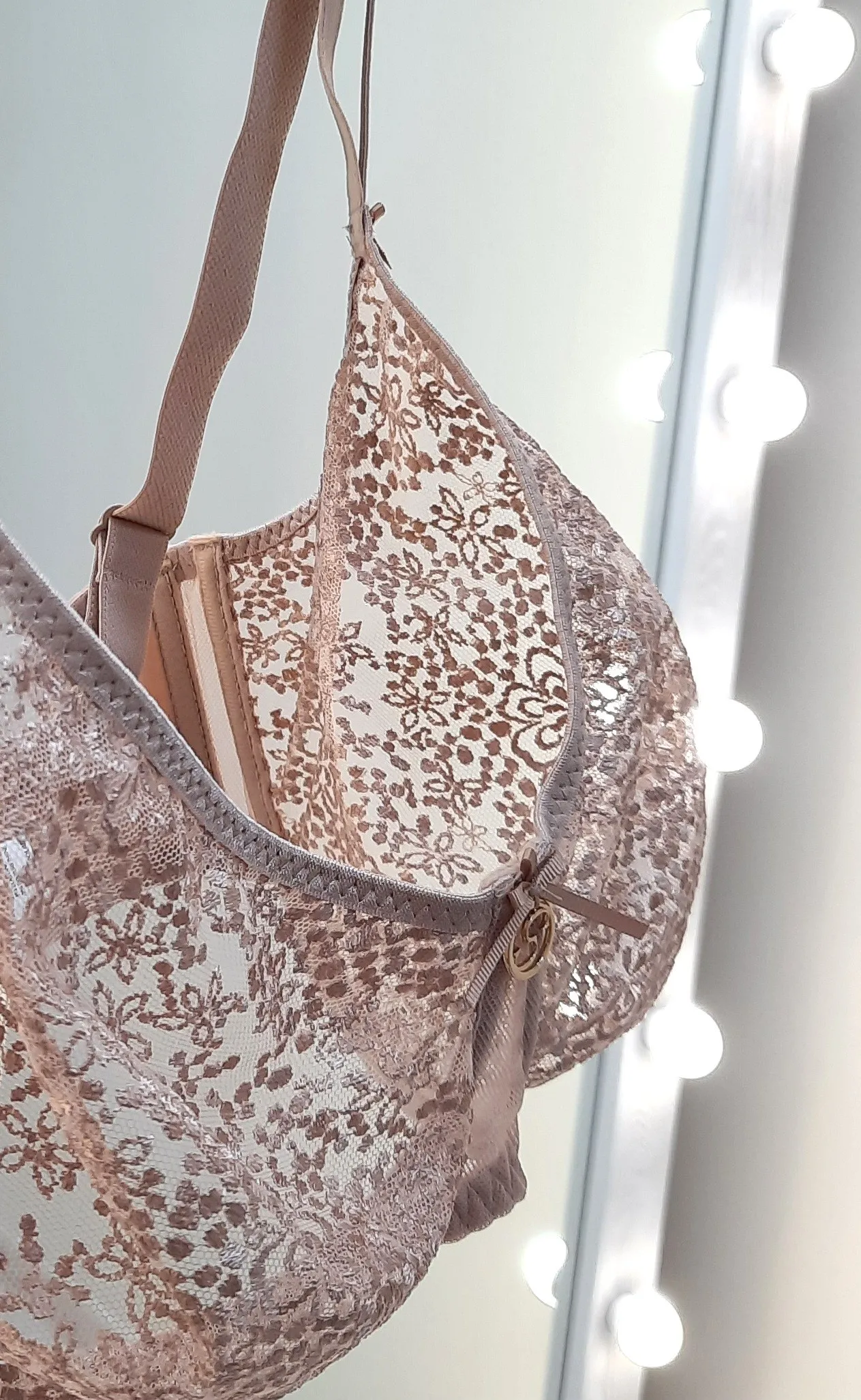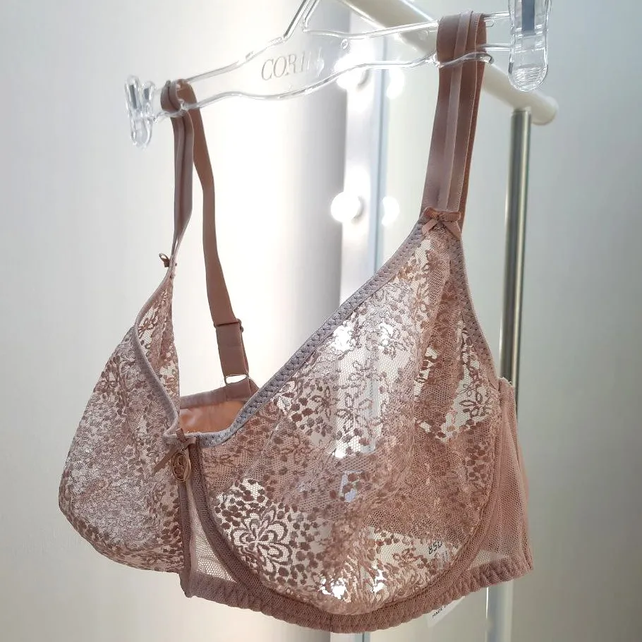 Кружевной бюстгальтер Корин Жизель натурально-бежевого цвета - Corin Gisele 30725 beige, с прозрачной кружевной чашкой на косточках. Очень эффектная, соблазнительная модель. Мягкая чашка без швов, формованная, выполнена из единой детали кроя, за счет фактуры ткани она хорошо поднимает и собирает грудь. Косточки хорошо окружают и обхватывают грудь, дополнительную поддержку создают боковые вертикальные косточки. Центральная панель между чашками из дышащей сеточки, украшена золотистой подвеской.