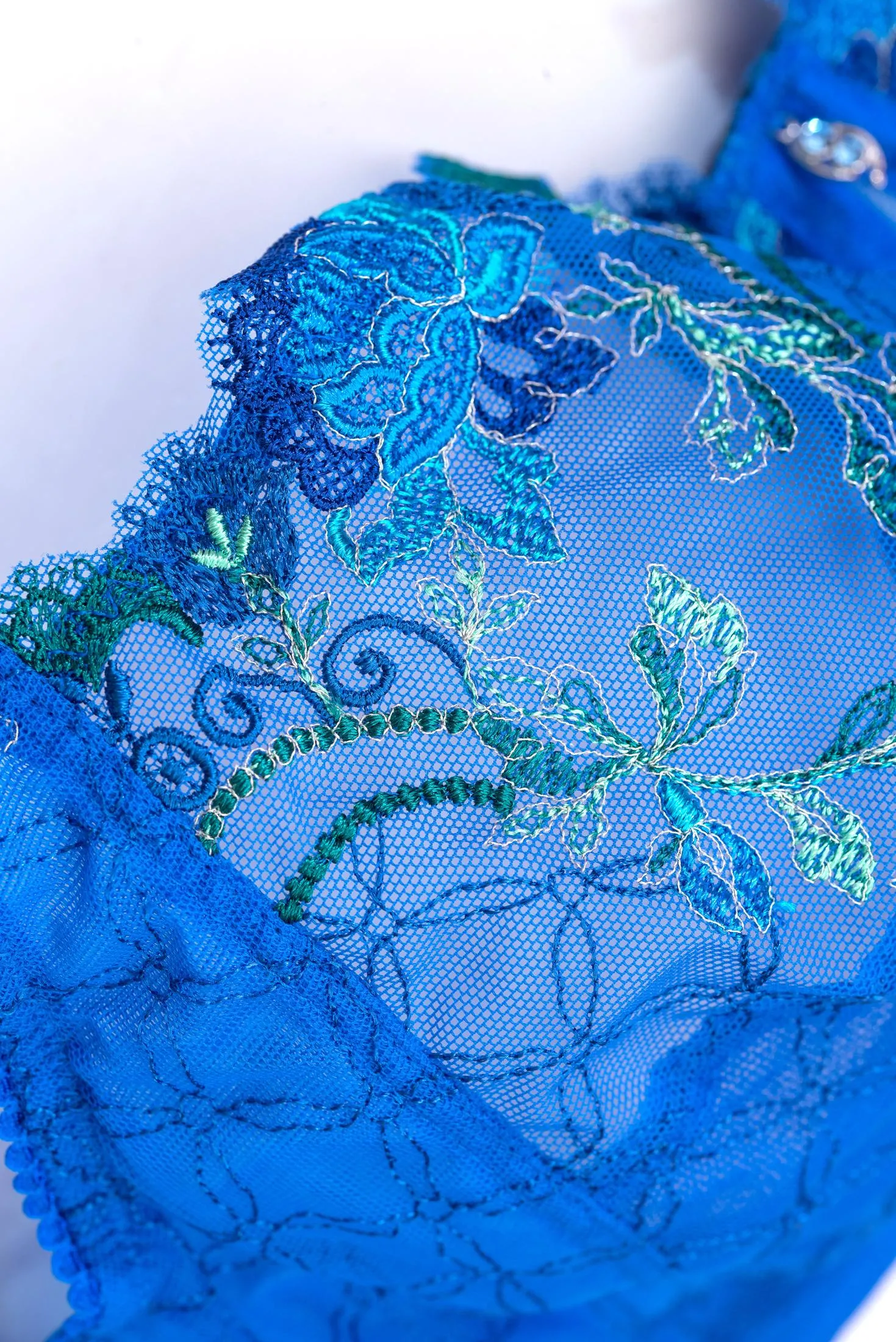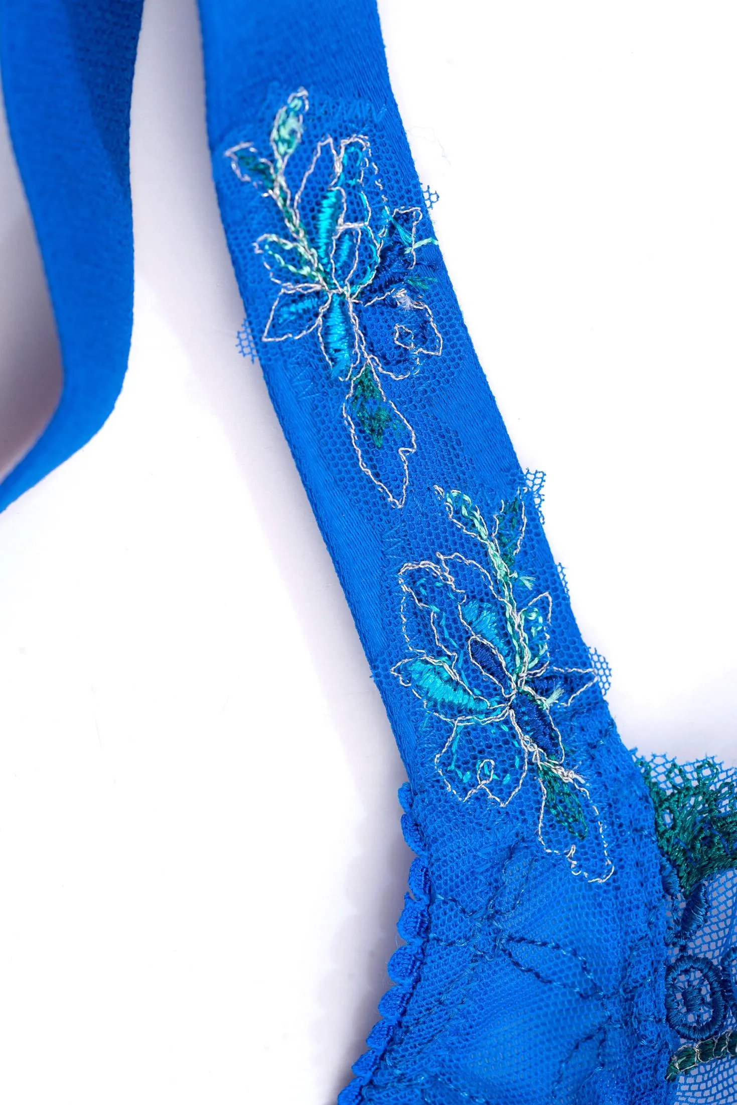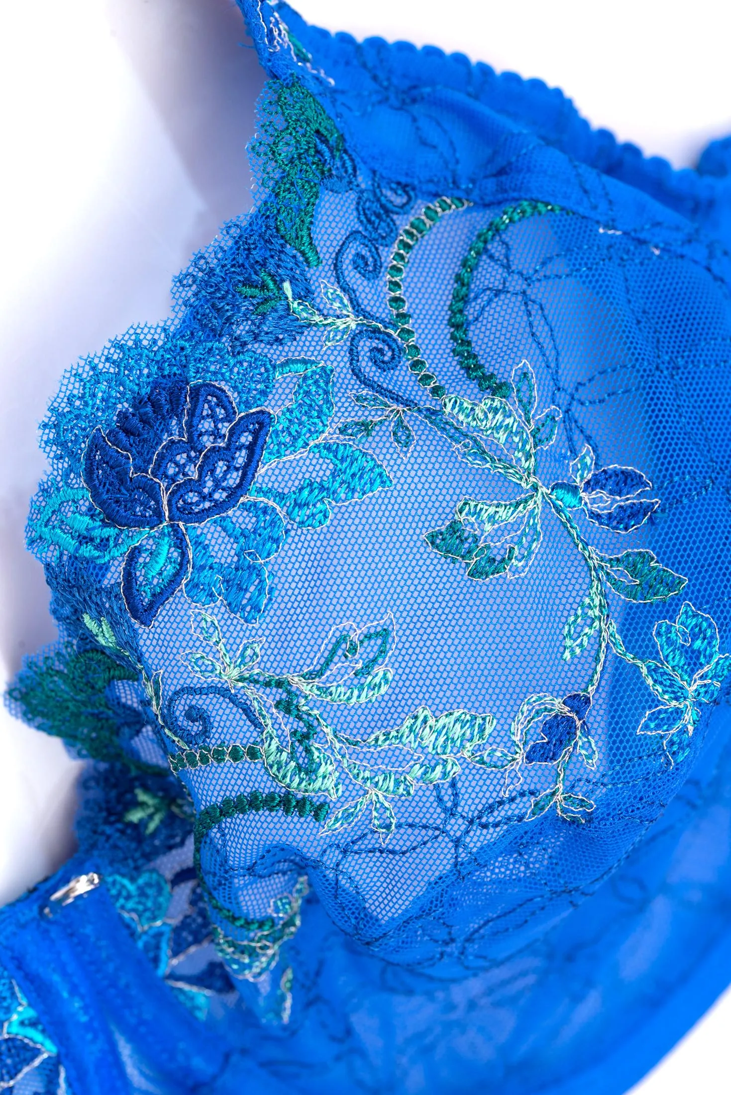 Бюстгальтер декорирован роскошной, разноцветной, итальянской вышивкой в несколько нитей. Легкий рисунок листьев и цветов подчеркивается серебристыми нитями, придающими объем и ощущение легкого движения. В этой линии сочетаются цветочные и геометрические узоры, создающие изящный графический рисунок.