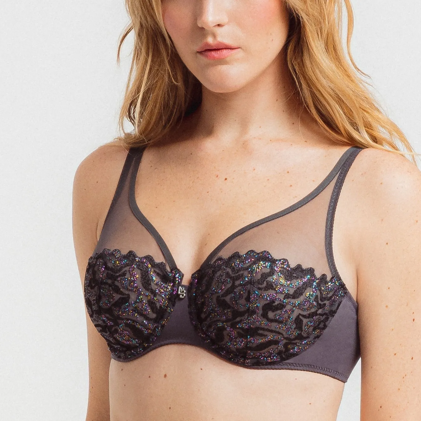 Бюстгальтер-платок Луиза Брак Электрик тёмно-серого цвета - Louisa Bracq Electric Waves 494 11 Soutien gorge Foulard SMK smoke. Красивая мерцающая вышивка, абстрактные мотивы. Мягкая, закрытая чашка на высоких косточках. Нижняя часть бюстгальтера напоминает балконет - высокая центральная арка и высокие косточки, хорошо обхватывают и поддерживают грудь. Вертикальный шов обеспечивает подъем. Верхняя часть чашки выполнена из тонкого, прозрачного тюля, сглаживающего силуэт. По краю чашки проходит эластичная окантовка.