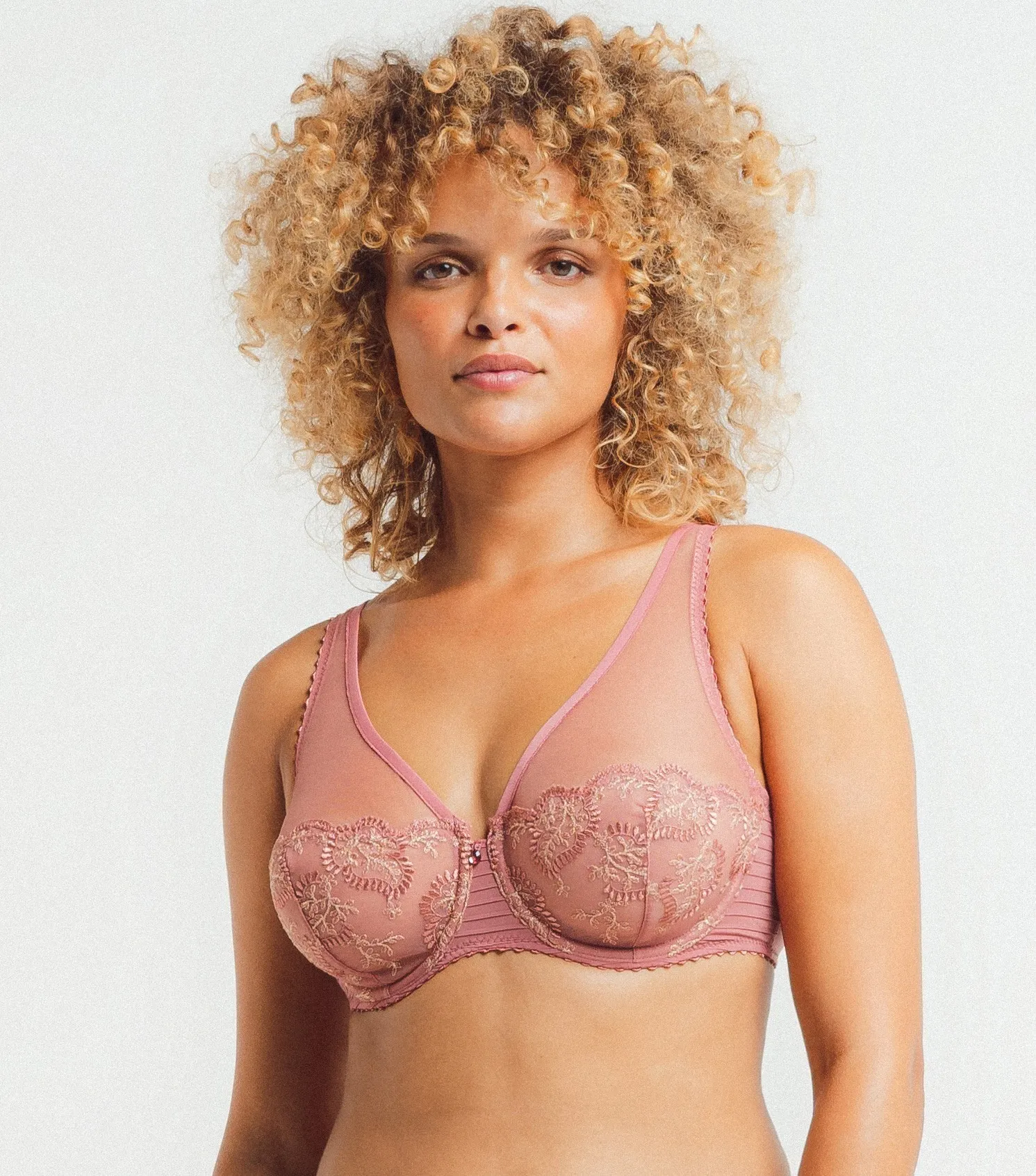 Закрытый прозрачный бюстгальтер на косточках Луиза Брак Элиз ярко-бежевого цвета пыльная роза - Louisa Bracq Elise SG FOULARD SCARF BRA 419 11 TRT terracotta. Нижняя часть чашки по конструкции близка к балконету, с вертикальным швом, приподнимающим грудь. Украшена вышивкой с цветочными мотивами. Верхняя часть закрытая, с переходом на бретели, выполнена из прозрачной сеточки. По краю чашки проходит эластичная окантовка для идеальной посадки и прилегания. Высокие косточки поддерживают грудь, создавая красивую форму.