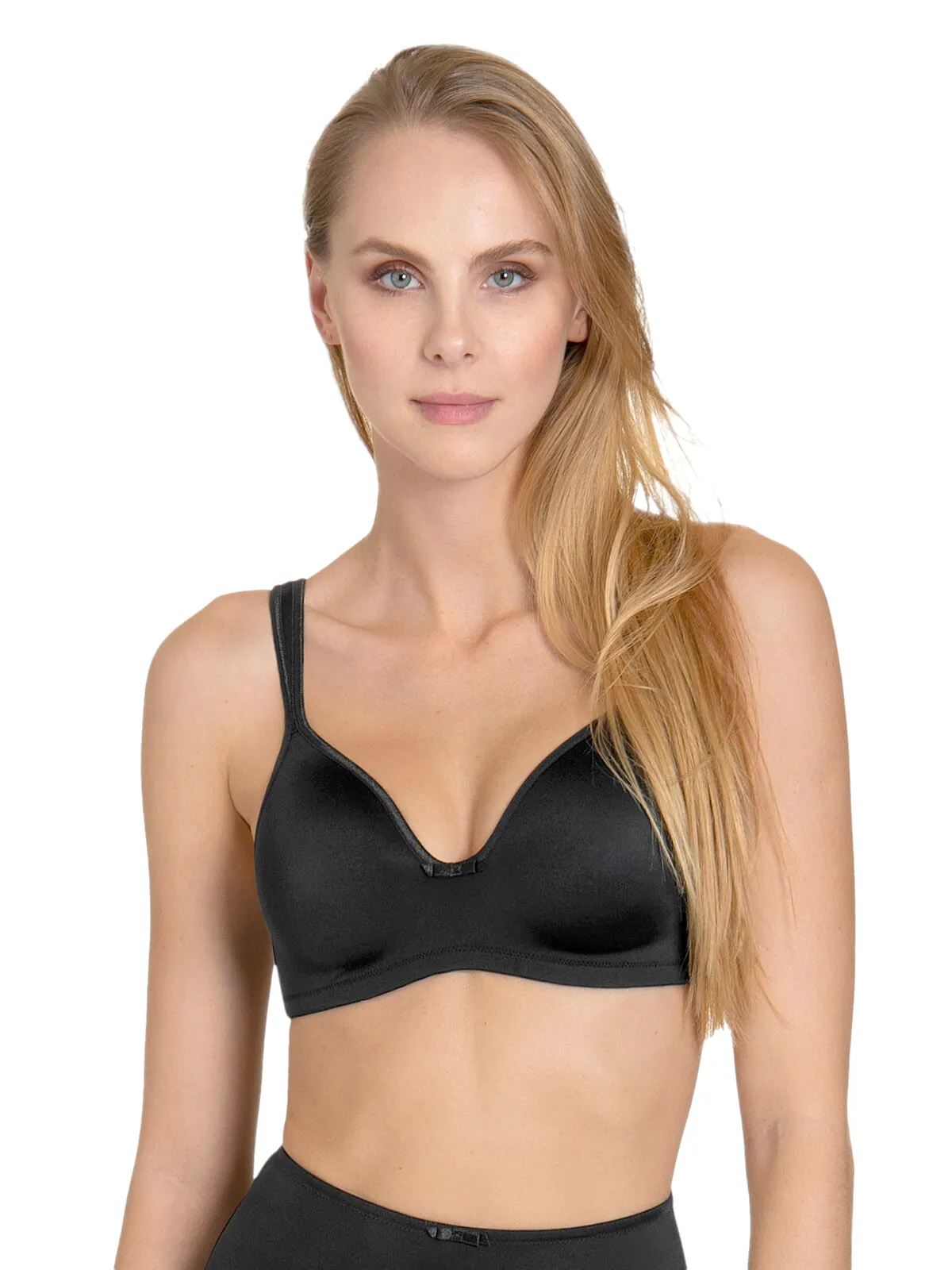 Бесшовный бюстгальтер с плотной чашкой без косточек Лиска Виктория чёрного цвета - Lisca Victoria 020145. Классический тишот-бралет с комфортной посадкой. Отличная формованная чашка на полупоролоне, внутри чашки - комфортная, нежная подкладка. Широкий эластичный пояс с вертикальными косточками обеспечивает поддержку и не доставляет дискомфорта, застегивается в трёх положениях. Бретели с регулировкой длины, чуть расширенные там, где соприкасаются с плечами. Бретели выполнены из мягкого плотного материала, снижающего давление на плечи.