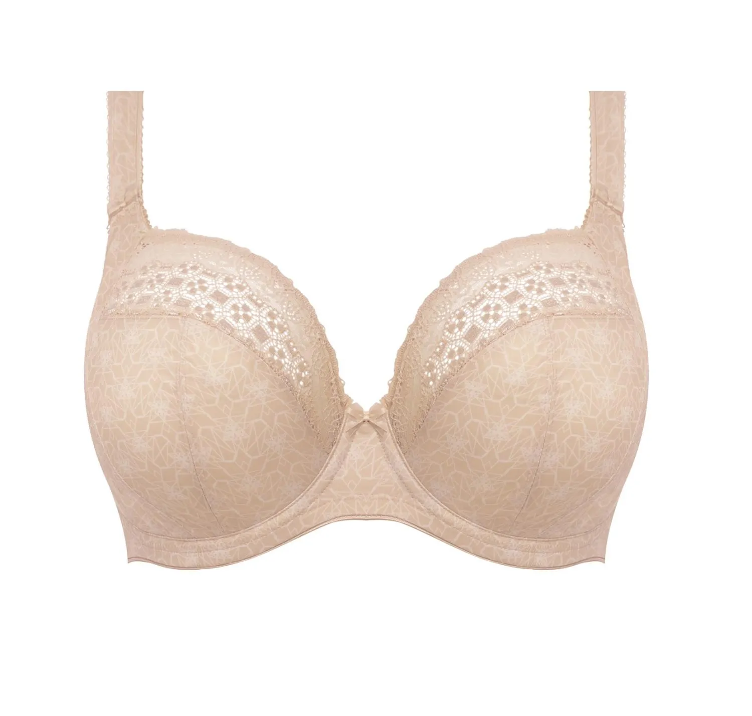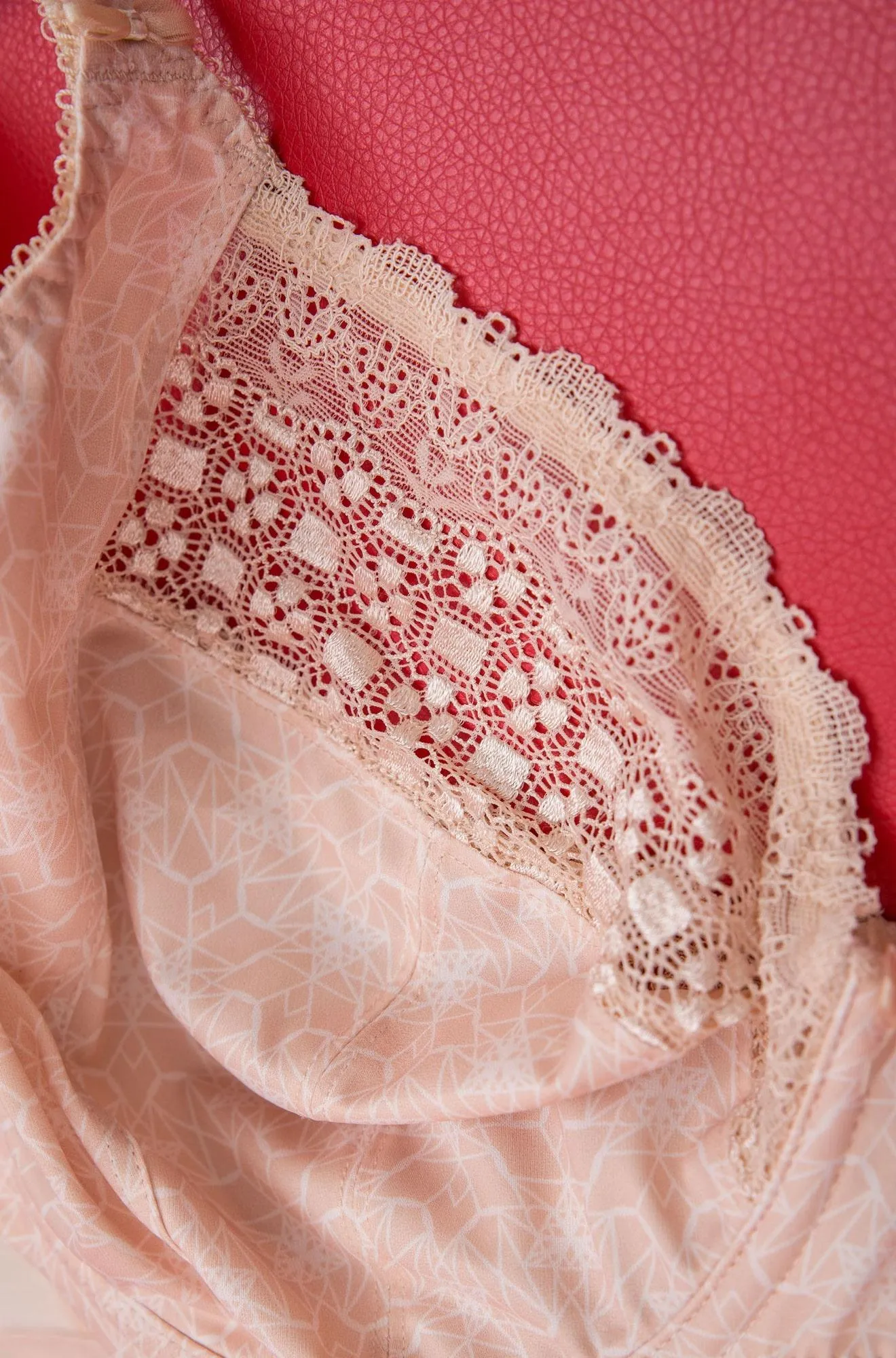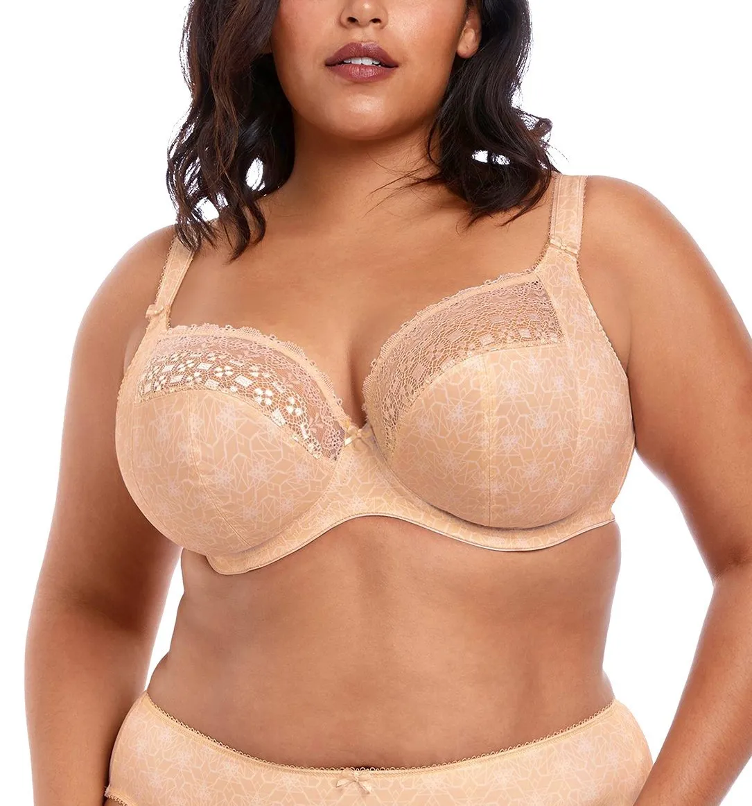 Бюстгальтер большого размера Эломи Ким бежевого цвета с принтом и кружевом. Отличная модель plus size с красивой формой и очень хорошей поддержкой для большой груди.