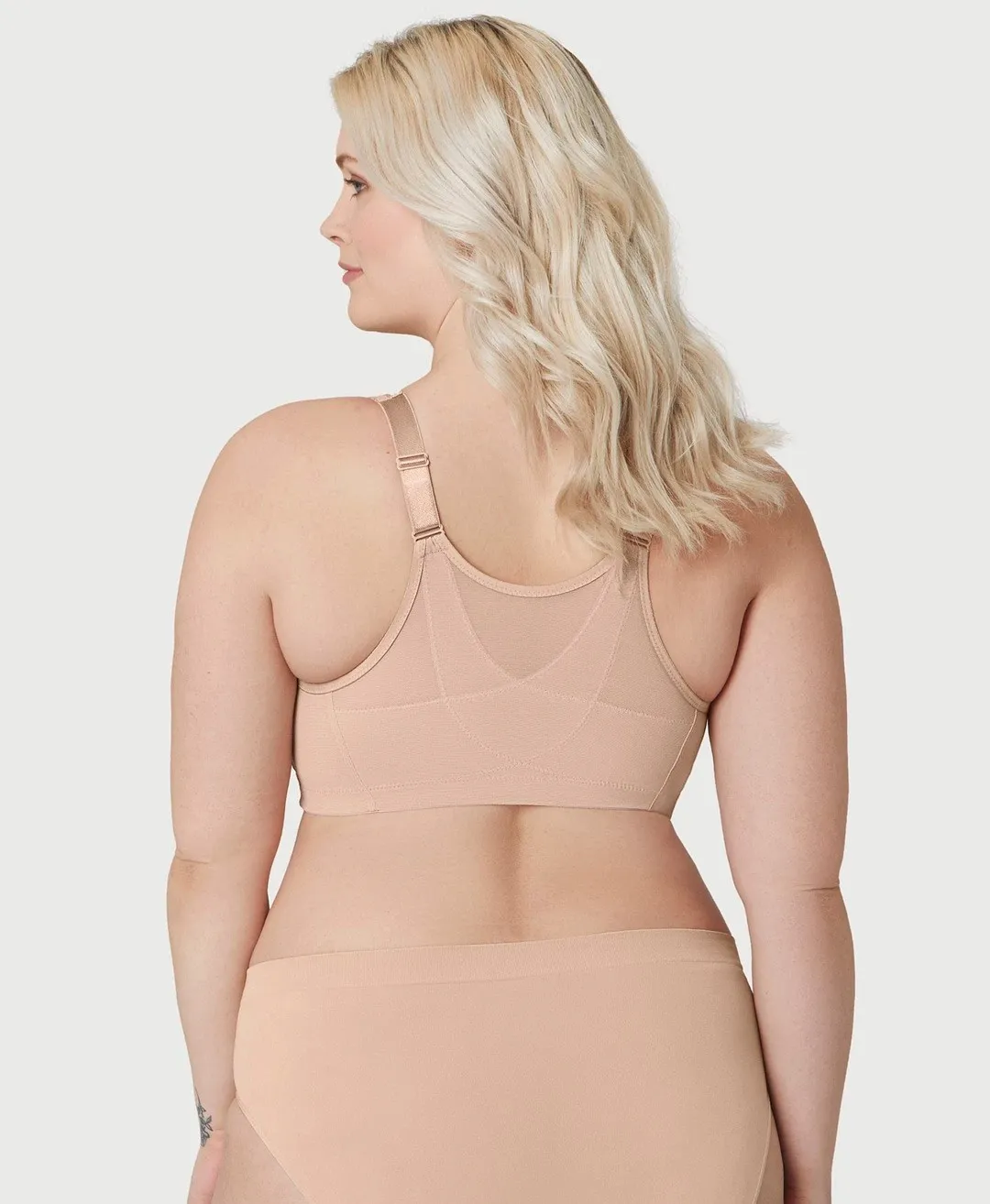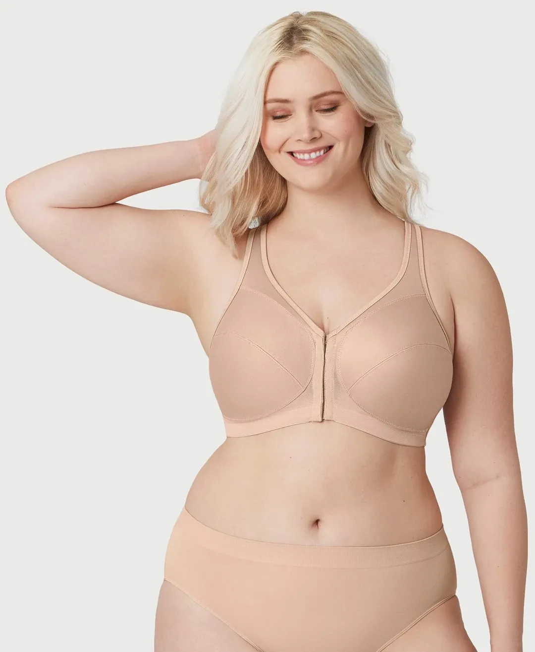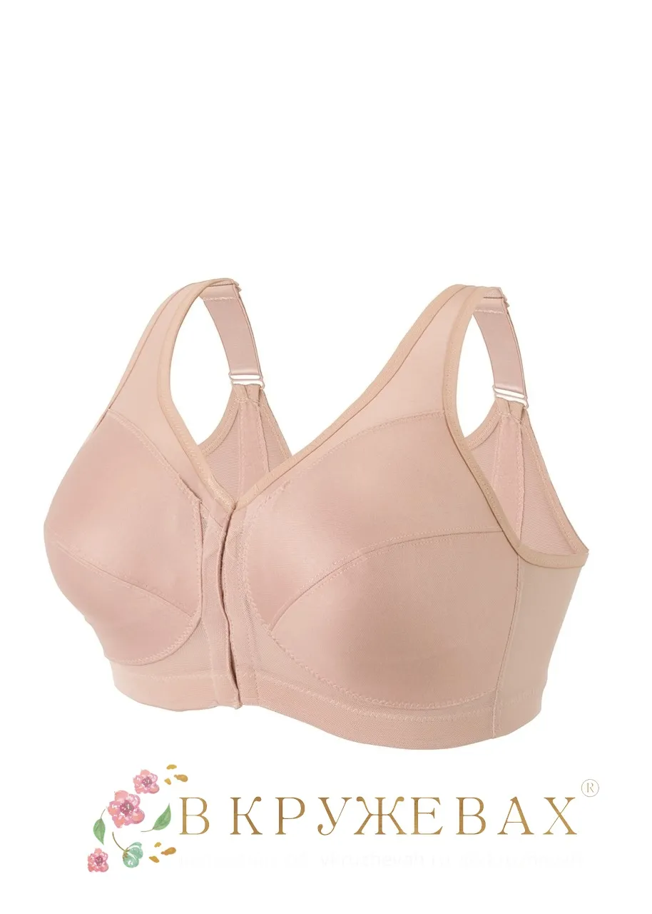 Бюстгальтер с мягкими чашками без косточек Гламорайз нежно-бежевого цвета Латте, с застежкой спереди. Спинка высокая, Т-образная, хорошо сглаживает силуэт спины. По спине изнутри проходят скрещенные эластичные ленты из деликатного материала хлопок-лайкра. Эти ленты обеспечивают хорошую посадку бюстгальтера и поддерживают осанку.
