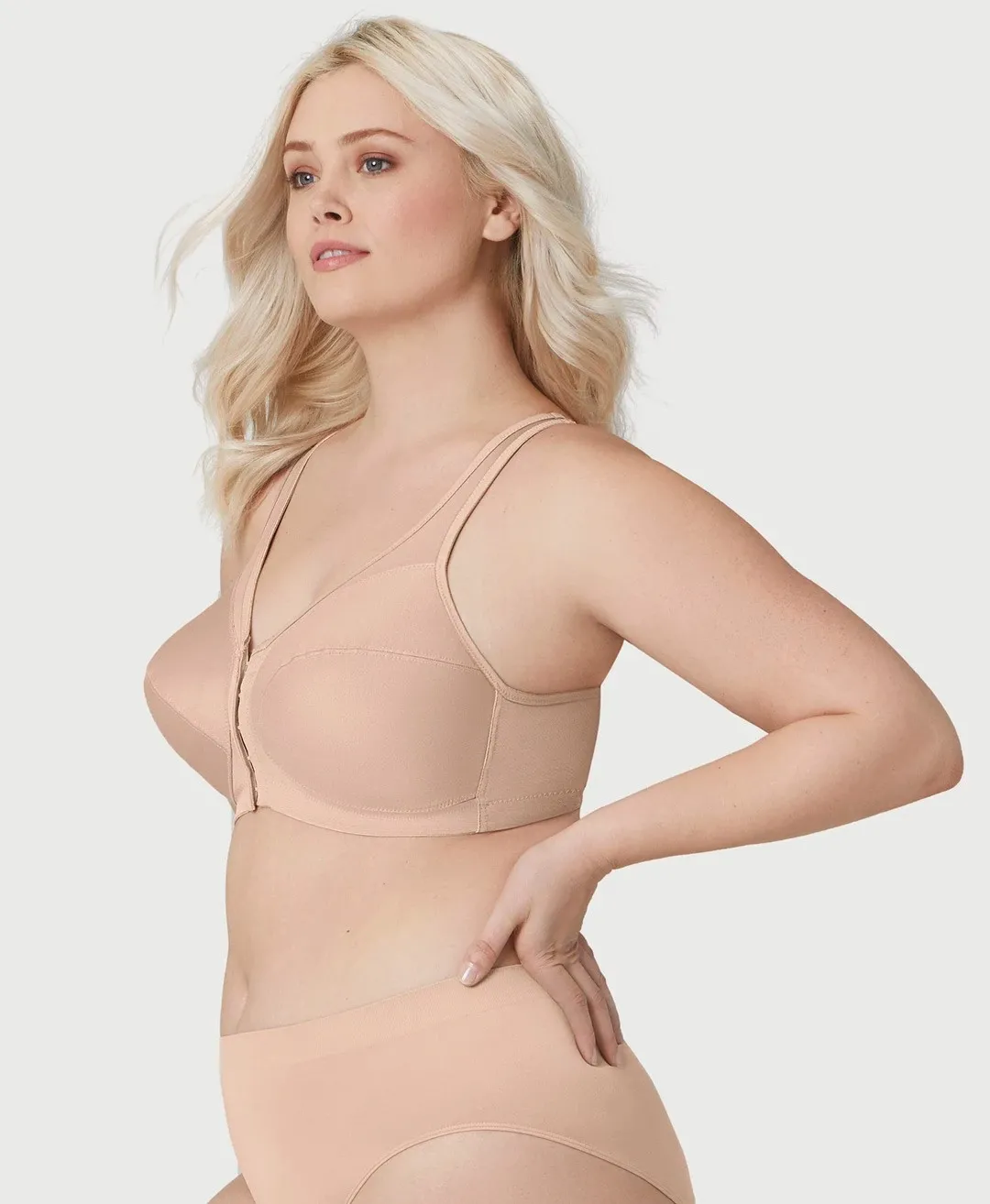 Glamorise используют особую, поддерживающую и очень удобную конструкцию пояса: пояс широкий, эластичная полоса проходит под краем чашек. Под мышками пояс расширяется в специальные поддерживающие панели.