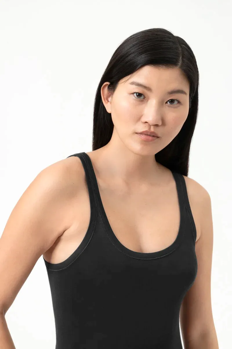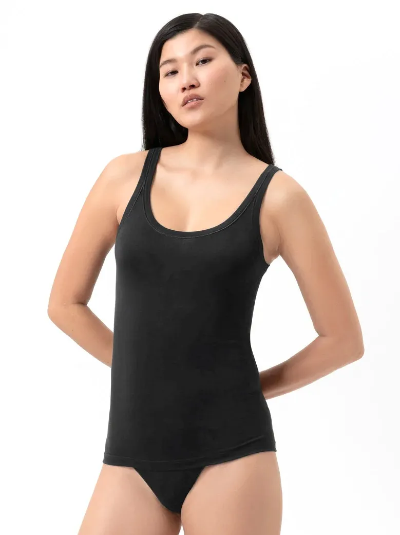 Классическая майка-топ из модала Мей Модал Пуэ чёрного цвета - Mey Modal Pure Top 1110053 3 schwarz. Топ выполнен в технике кругового "вязания" - без боковых швов, его можно надевать под облегающую одежду. Зауженные бретели, близко посаженные, закругленные вырезы и декольте. Длина топа - до бёдер. Комфортный материал из тонкого трикотажа нежно облегает фигуру, создавая ровный силуэт. Материал тонкий, очень эластичный, не мнётся. Ткань приятна на ощупь: 94% модал, 6% эластан.