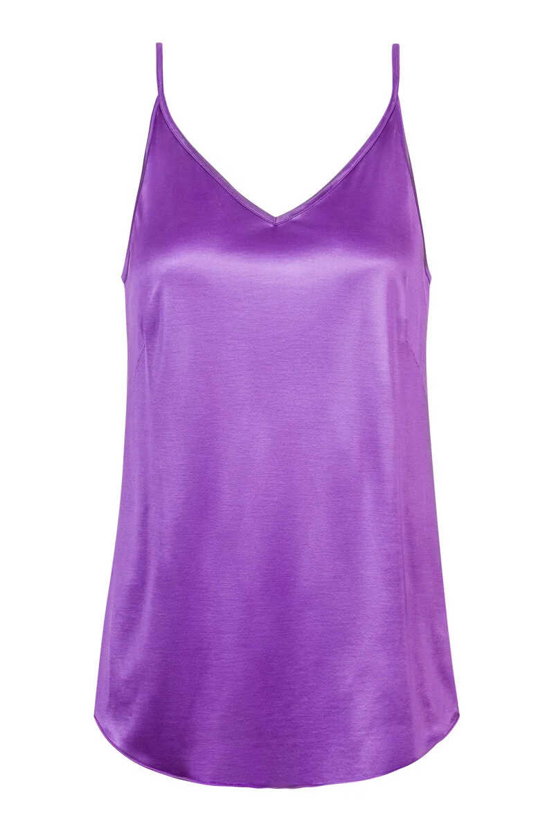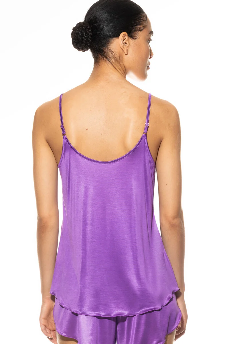 Топ с бретелями Мэй Коко ярко-фиолетового цвета орхидея - Mey French Camisole Serie Coco 45015 550 Wild Orchid. С тонкими бретелями с регулировкой длины на золотистой металлической фурнитуре. Наполовину открытая спина, свободный крой. Выполнен из красивой шелковистой ткани: 59% вискоза, 41% модал. Это изделие соответствует сертификату Oeko-Tex-Standard 100 - ткань выполнена из экологичных и безопасных для кожи материалов.