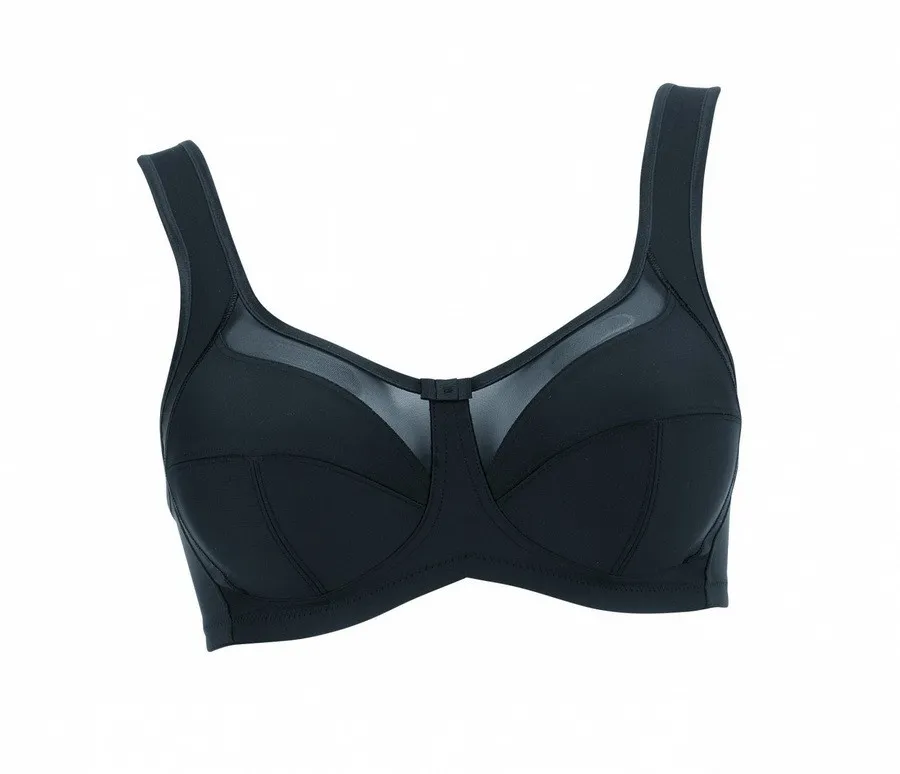 Комфортный бюстгальтер без косточек Анита Клара черного цвета - Anita Comfort Soft Bra 5459 007 black. Повседневный бюстгальтер с надежной поддержкой груди. Классическая трехчастная чашка с боковыми поддерживающими панелями, переходящими на бретели. За счет такой конструкции обеспечивается дополнительный подъем и поддержка. Сочетание вертикального и горизонтального швов на чашке создает красивую естественную форму. Верхняя часть чашки - из сетчатой вставки, которая сглаживает рельеф и не препятствует воздухообмену. Нижняя часть чашки - двуслойная, создает дополнительную поддержку.