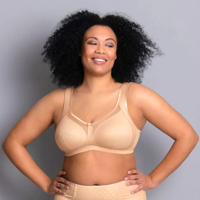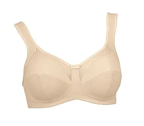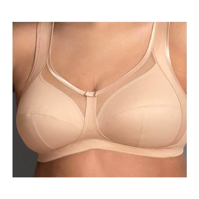 Комфортный бюстгальтер без косточек Анита Клара бежевого цвета - Anita Comfort Soft Bra 5459 007 sand. Повседневный бюстгальтер с надежной поддержкой груди. Классическая трехчастная чашка с боковыми поддерживающими панелями, переходящими на бретели. За счет такой конструкции обеспечивается дополнительный подъем и поддержка. Сочетание вертикального и горизонтального швов на чашке создает красивую естественную форму. Верхняя часть чашки - из сетчатой вставки, которая сглаживает рельеф и не препятствует воздухообмену. Нижняя часть чашки - двуслойная, создает дополнительную поддержку.