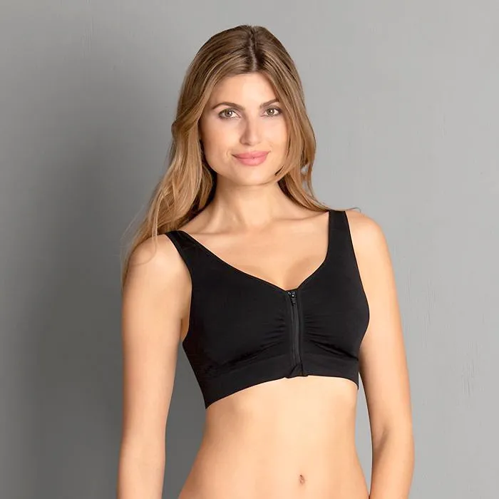 Мягкий топ-бюстгальтер без косточек для дома и отдыха Анита Кеа Лин чёрного цвета - Anita Care Lynn Prothesen-BH 5768 black. Обеспечивает хорошую поддержку большой груди за счет эластичного пояса. Пояс широкий, за счет ширины создает уверенную поддержку, хорошо фиксируя грудь. Впереди под чашками - плотная широкая резинка, которая заменяет косточки и не препятствует кровообращению. Впереди - застежка-молния защитой кожи от замка. Внутри - съемные поролоновые чашечки в кармашках. Бретели с регулировкой длины, сзади классической ширины, впереди - широкие у основания. Бюстгальтер создает гладкий силуэт, не ощущается на теле и создает ощущение "второй кожи".