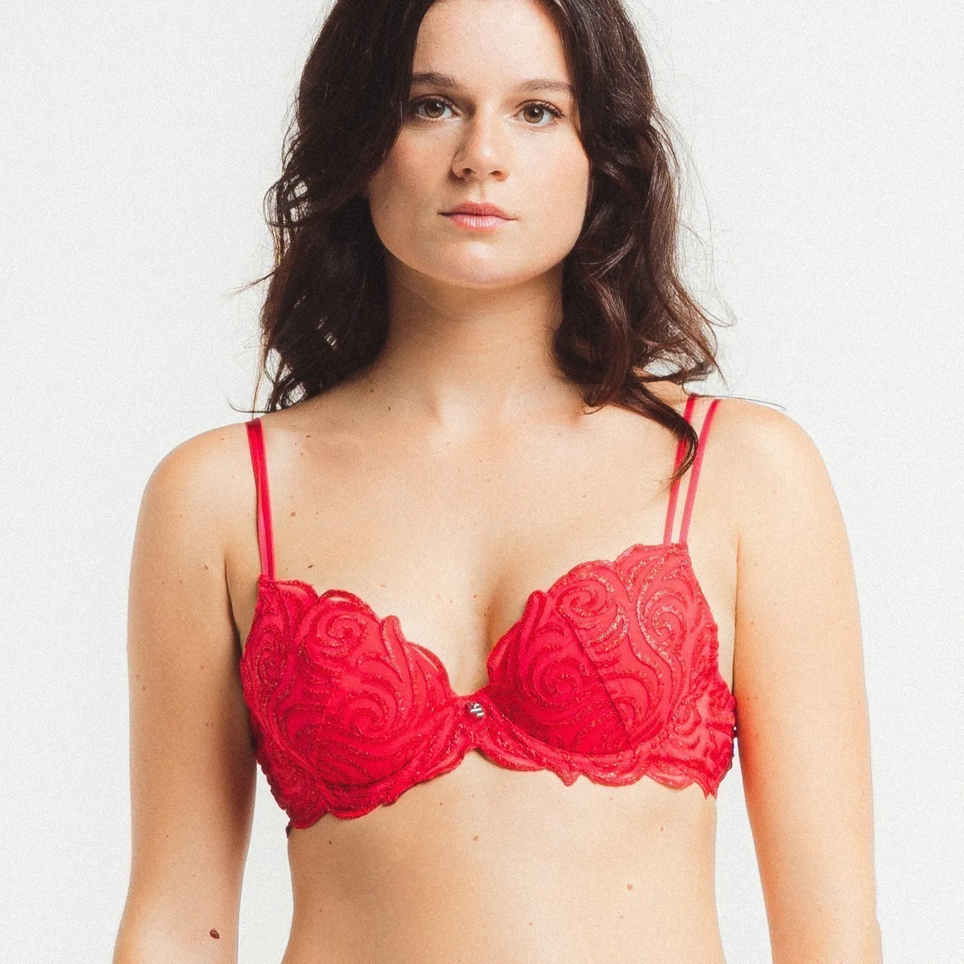 Бюстгальтер пуш ап Луиза Брак Трайбл ярко-красного цвета Гибискус - Louisa Bracq Tribal SG Emboitant full cup bra 484 05 HBC hibiscus. Изысканные мотивы кружева, имитирующие татуировку, романтичные завитки.