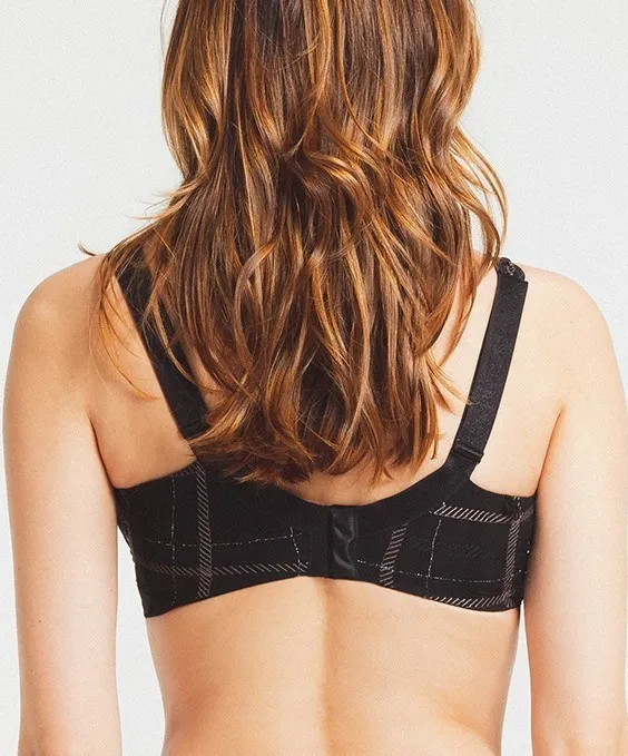 Уплотненная дышащая чашка без косточек создает красивую гладкую форму и поддерживает грудь. Внутри - хлопковая подкладка из тонкого, мягкого трикотажа. Верхний край чашки - с дополнительной деталью. кроя, которая поднимается высоко над основанием бретелей, закрывая грудь и создавая поддержку по внутреннему края. Пояс широкий сзади, по бокам и впереди проходит под чашками, дополнительно поддерживая. Пояс украшен декоративным слоем вышитой сеточки в клетку.