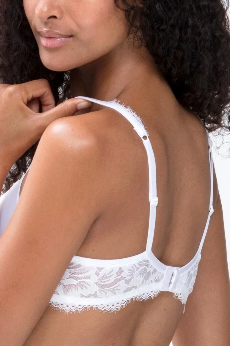 Бюстгальтер-спейсер Мэй Амазинг белого цвета - Mey AMAZING Spacer bra | Half Cup 74237 1 white. Плотная, дышащая чашка на косточках. Чашка классической формы, наполовину открывает грудь. Чашки выполнены из инновационного 3D-материала. Он легко пропускает воздух, чашка достаточно тонкая и сверхлёгкая. Но при этом чашка сохраняет форму и создает гладкий силуэт. Чашка, пояс и бретели украшены изящным кружевом с ресничками. Центральная панель и пояс выполнены из ажурного, плоского кружева с цветочными мотивами. Бретели с регулировкой длины, широкие в области плеч и узкие на спине. Бретели узко посажены, не спадают и создают хорошую поддержку груди. Пояс застёгивается в 3 положения, число крючков увеличивается с увеличением размера чашки.