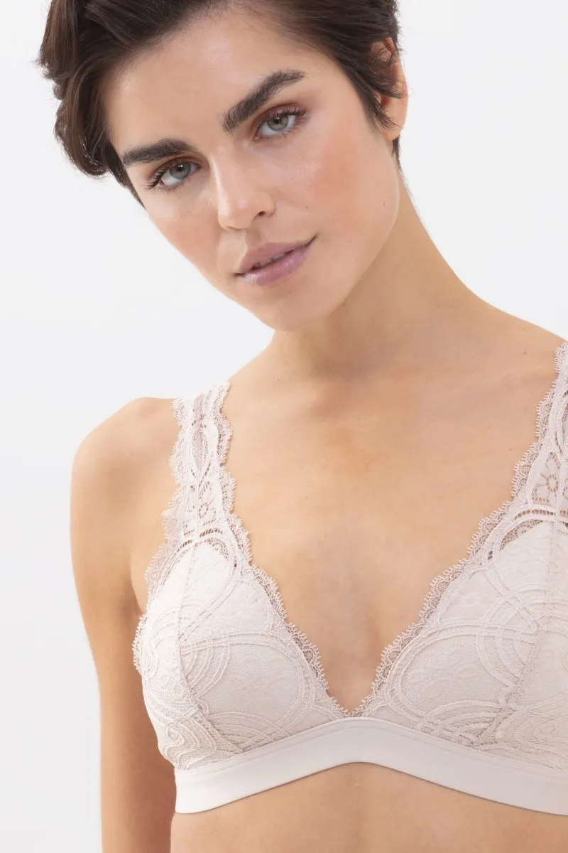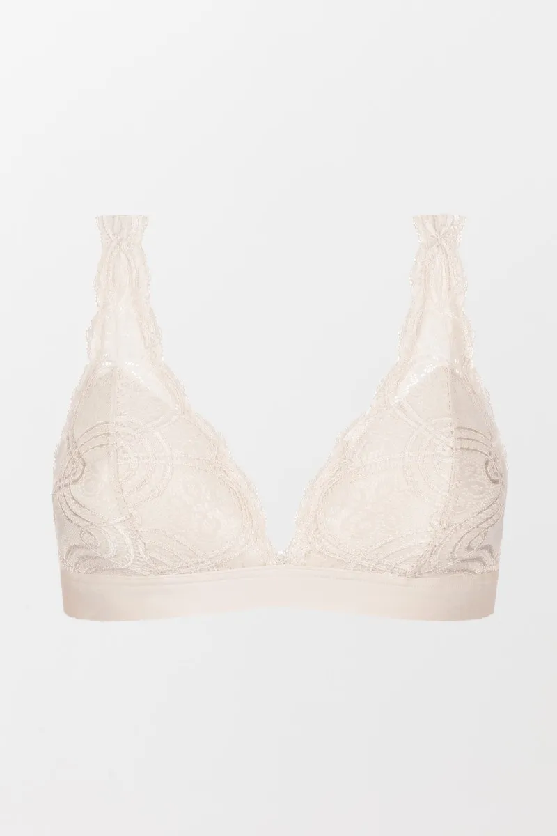 Бюстгальтер-бралет с треугольными чашками Мэй Поэтри Фейм нежно-бежевого цвета бейлиз - Mey Triangel-BH Serie Poetry Fame 74130 - 703. Уплотненная треугольная чашка без косточек, на эластичном поясе, который обеспечивает достаточную поддержку груди. Снаружи чашка украшена полупрозрачным кружевом с геометрическими мотивами и кружевной волнистой оборкой. Вертикальный шов поднимает и поддерживает грудь. Верх чашки высоко поднимается на бретели. Такая конструкция выигрышно показывает грудь небольшого размера.