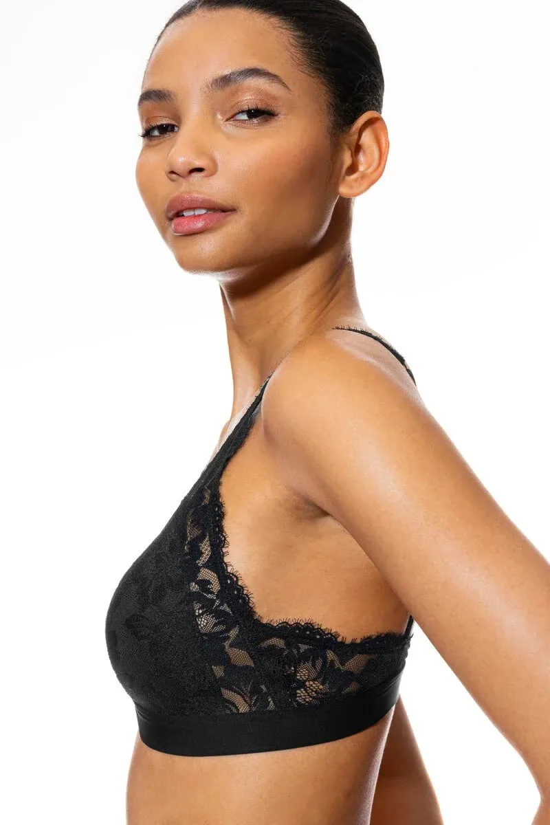 Бюстгальтер-бралет с треугольными чашками Мэй Поэтри Вог чёрного цвета - Mey Triangel-BH Serie Poetry Vogue 74233 3. Уплотненная треугольная чашка без косточек, на эластичном поясе, который обеспечивает достаточную поддержку груди. Снаружи чашка украшена полупрозрачным кружевом с цветочными мотивами и кружевными ресничками. Вертикальный шов поднимает и поддерживает грудь. Верх чашки высоко поднимается на бретели. Такая конструкция выигрышно показывает грудь небольшого размера.