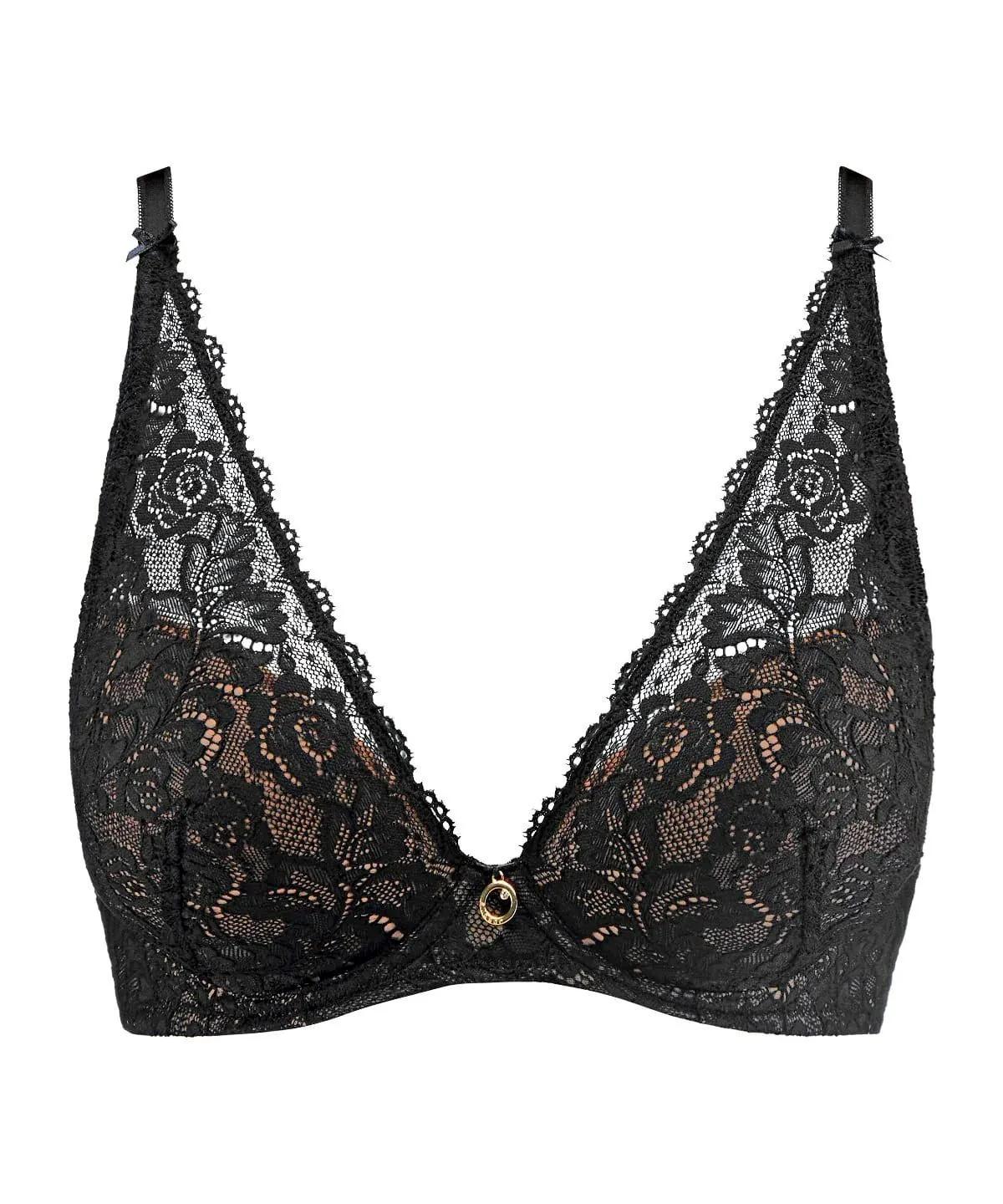 Бюстгальтер-платок с треугольной чашкой Обад Роузсенс черного цвета - Aubade Rosessence 2KN81 2K. Элегантное цветочное кружево на тонкой подложке золотисто-бежевого цвета. Великолепное швейцарское кружево. Мягкая чашка на косточках. Чашка закрытая, треугольная. Чашка многослойная, внутри вшитые поддерживающие панели для поддержки красивой формы. Чашки закрытые, основание высоко поднимается на бретели. Конструкция бюстгальтера-платка очень хорошо собирает грудь, поднимает и удерживает, сглаживая при этом рельеф межу молочной железой и грудной клеткой.