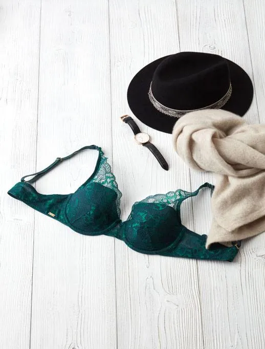 Сочетание цветов просто восхитительное: блестящее зеленоватое кружево поверх насыщенно-изумрудной ткани - очень похоже на малахит или изумруд. Великолепный бюстгальтер для тех, кому хочется роскоши.