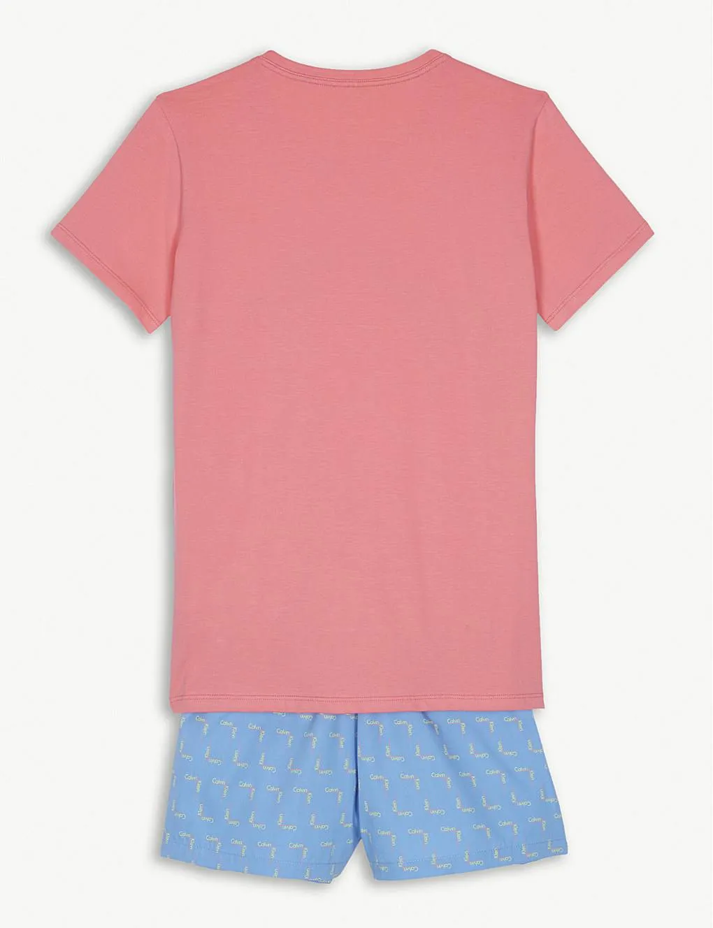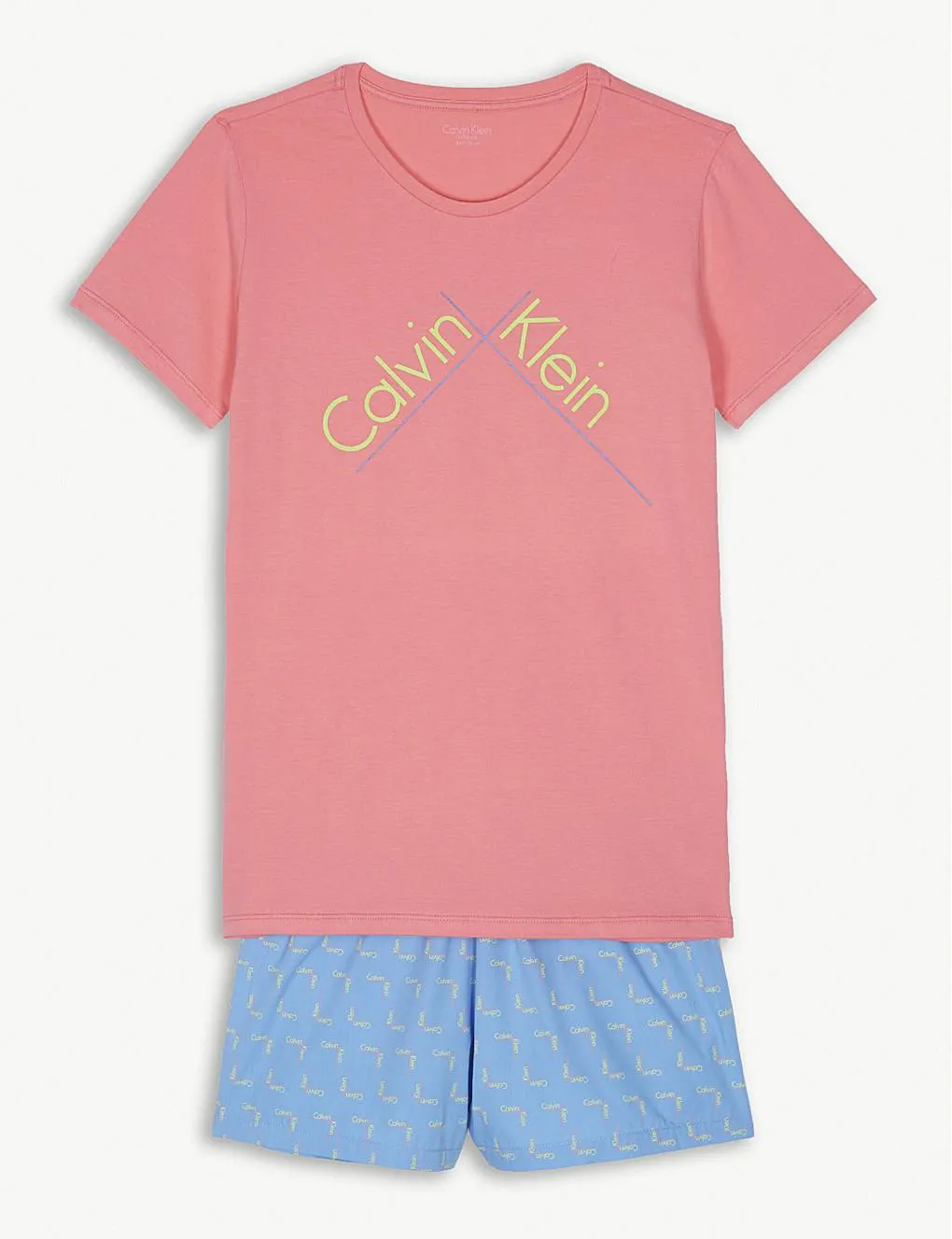 Хлопковая пижама для девочки Кельвин Кляйн. Розовая футболка с коротким рукавом и фирменный знаком и свободные короткие шорты голубого цвета. 100% хлопок.