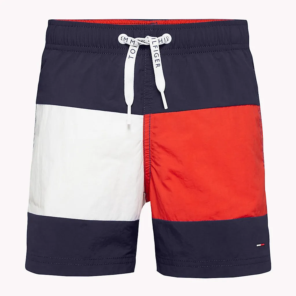 Пляжные плавки-шорты для мальчиков Томми Хилфигер темно-синие с красными и белыми цветовыми блоками в традиционных цветах бренда. Пояс-резинка с контрастным шнурком, карман сзади.