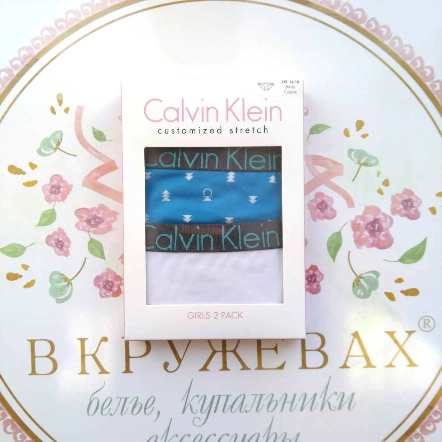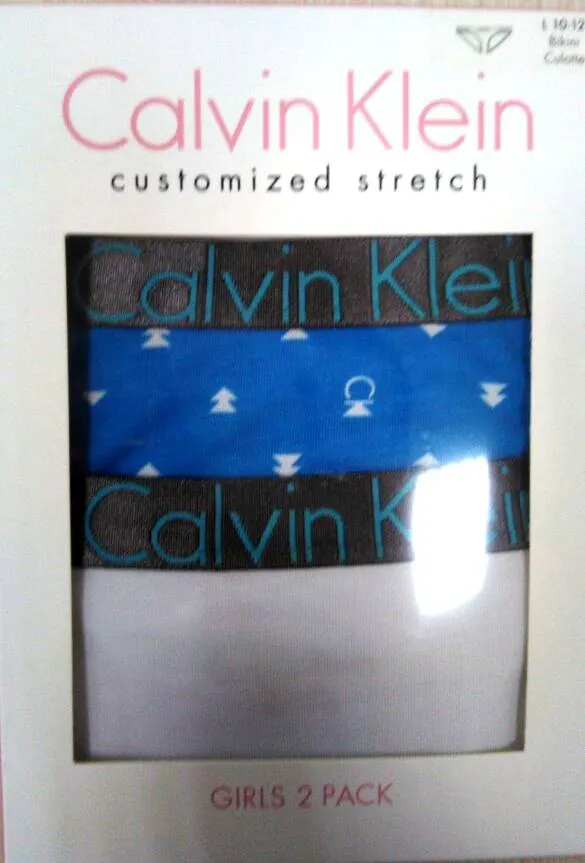 Трусики-слипы для девочек Кельвин Кляйн - упаковка из 2 штук, однотонные белые и ярко-голубые с фирменным принтом. Серебристо-черный пояс-резинка. 95% хлопок 5% эластан