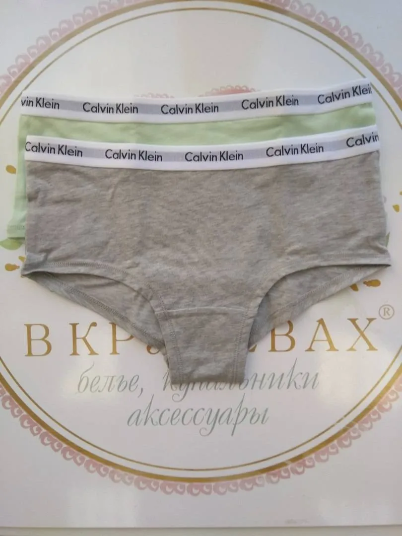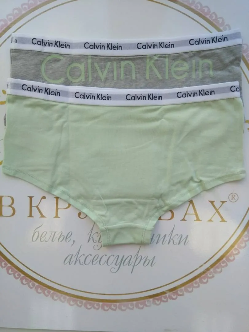 Трусики шортики для девочек Кельвин Кляйн - упаковка из 2 штук, серые и светло-зеленые. Контрастный логотип бренда на поясе-резинке. 95% хлопок 5% эластан