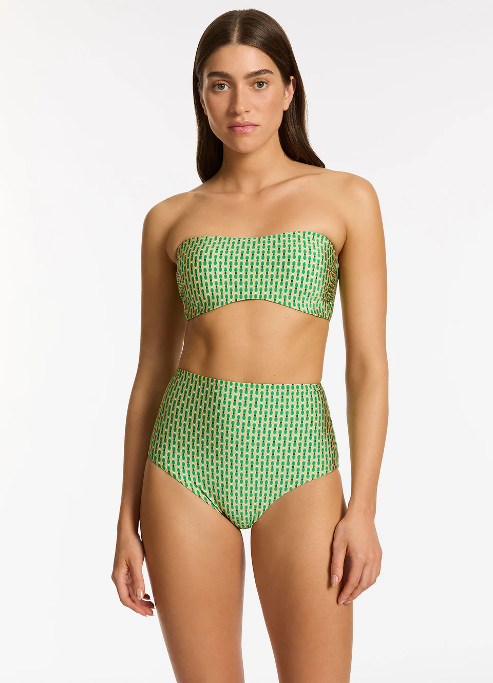 Топ бандо Джетс Флора с геометрическим принтом в оттенках зелёного - Jets Mattala Geo Moulded Bandeau Bikini Top Flora J40757. С уплотненными бесшовными чашечками и широким поясом. Отлично держится без бретелей. Дополнительную поддержку создают вертикальные боковые косточки, благодаря которым ткань не складывается и не сминается на поясе. Пояс застёгивается на широкую, плоскую застежку. Подходит для груди с чашкой А, B, C. Центральная панель топа внизу арочной, выгнутой формы - такая конструкция исключает давление на живот и диафрагму. В комплекте - съемные бретели с регулировкой длины, которые можно застегивать классическим способом через плечо, крест-накрест или вокруг шеи. Однако бандо хорошо садится и удерживается на месте без бретелей.