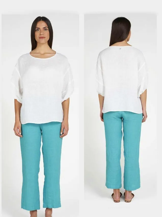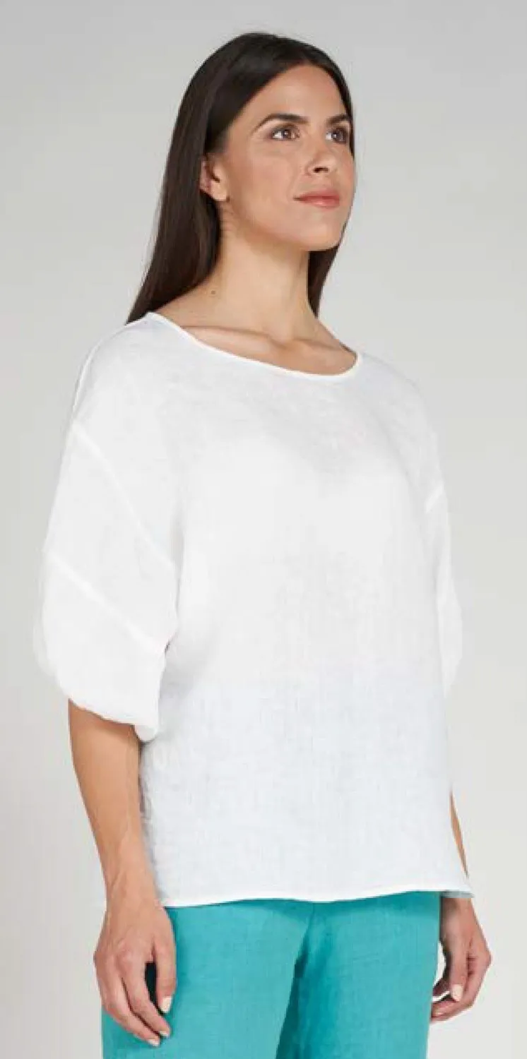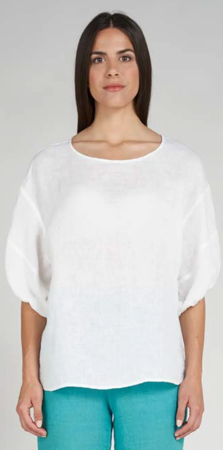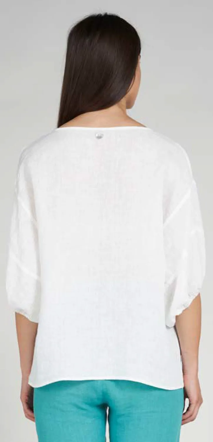 Льняная блуза-топ LFDL La Fabbrica Del Lino белого цвета - 926 04 bianco. 100% лён. Широкие рукава-фонарики, собранные на узкой манжете. Полукруглая горловина. Сзади застежка на пуговицы из перламутра. Сшито в Италии.