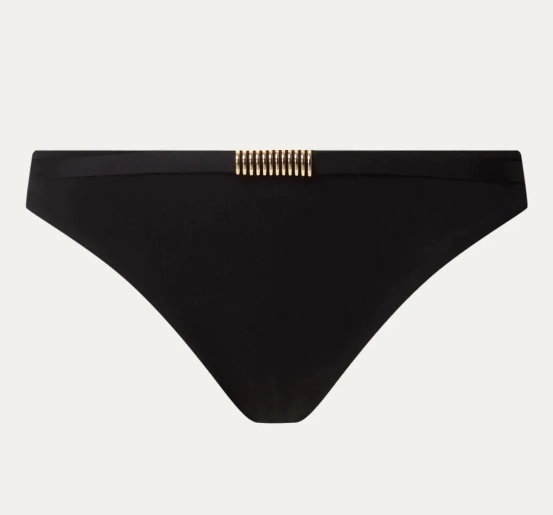 Классические плавки Шантель Икона стиля чёрного цвета - Chantelle Icon Brief C16VA0 011 noir. Плавки двуслойные, создают гладкий силуэт, сглаживают рельеф. Заниженная линия талии оставляет живот открытым. Ягодицы наполовину открытые. По линии талии - узкий эластичный поясок с золотистым украшением. Выполнены из высококачественной итальянской ткани.