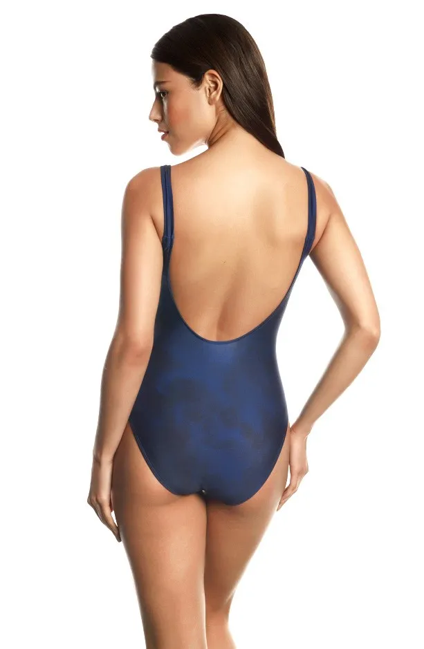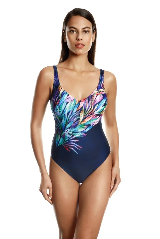 Испанский купальник Докор Оушен с чашкой C, с принтом листья / перья на синем фоне - Docor Ocean 2037 C 145 Shape control. С защитой от ультрафиолета, фактор защиты: UPF 50+. Уплотненная чашка без косточек из тонкого полупоролона создает гладкий силуэт груди. Широкие бретели фиксированной длины. Открытая спина с глубоким, до талии, вырезом. Купальник с эффектом коррекции фигуры.