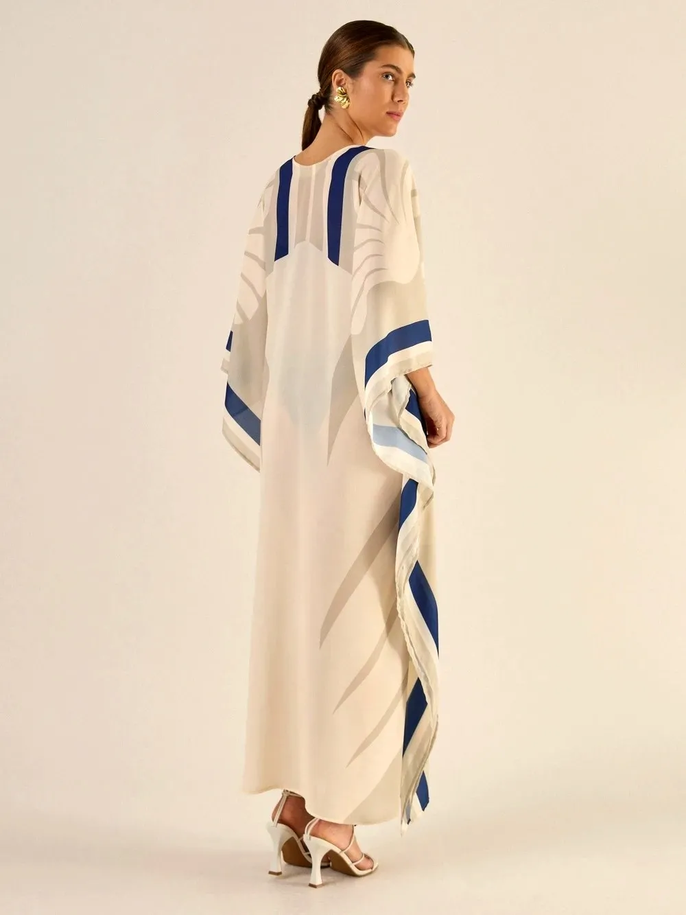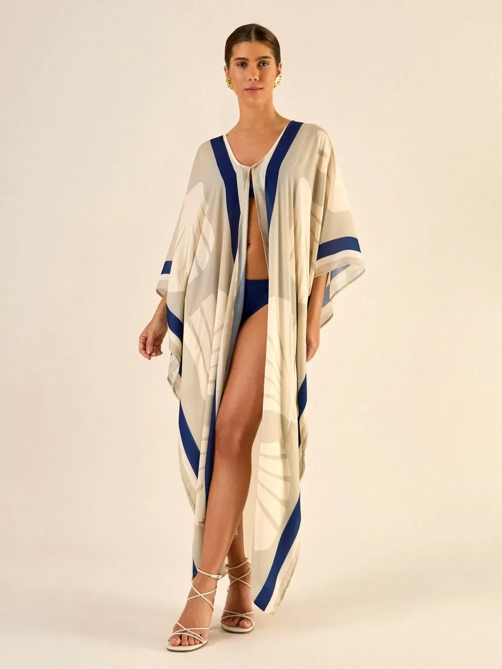 Пляжный кафтан-туника РдоСол Ибица светло-бежевого цвета с темно синими вставками - R. do Sol 6534830. Легкий, приятный текстильный материал: 100% полиэстер. Прямой крой, широкий силуэт, рукава со спущенным плечом.