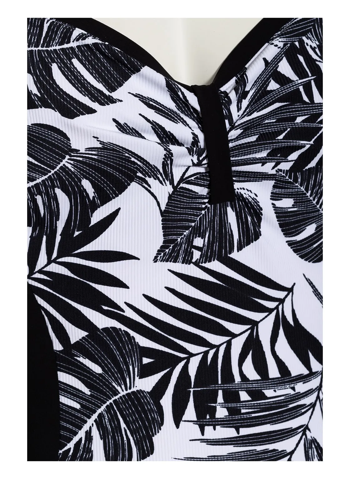 Слитный купальник Лидеа с растительным принтом Листья пальмы на белом фоне - Lidea 8653 975 Leaves. Выполнен из ткани с эффектной текстурой в мелкий рубчик. Бретели-спагетти, открытая спина с глубоким вырезом.