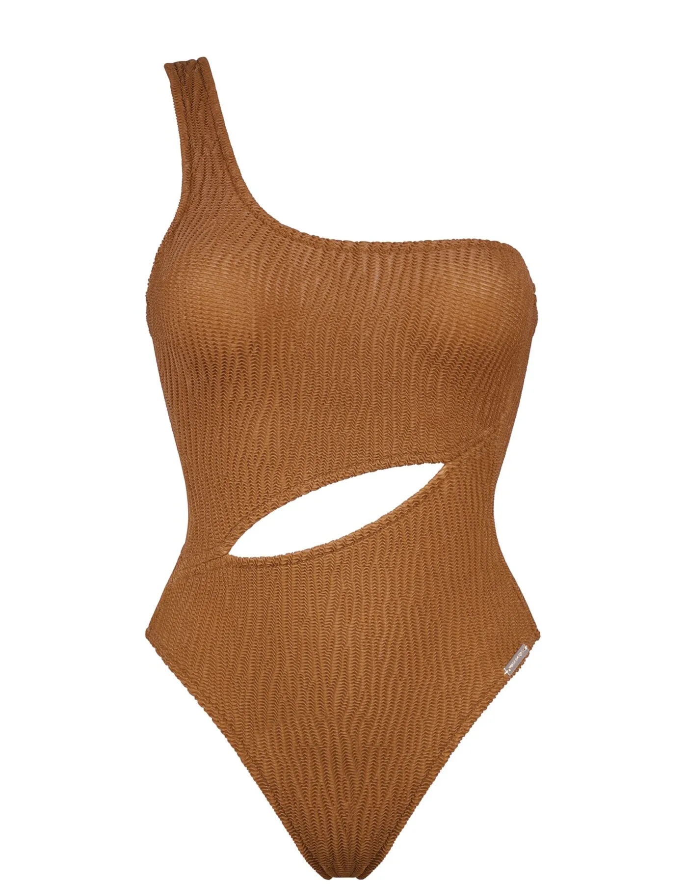 Слитный купальник с асимметричным кроем Вотеркалт Корица золотисто-коричневого цвета- Watercult Textured Basics ASYMMETRIC SWIMSUIT 8072_209_479 brown sugar. Выполнен из эффектной текстурированной жатой ткани с текстурой волны. Красивый диагональный вырез на талии.