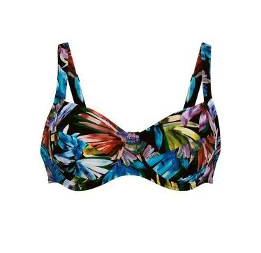 Верх купальника для большой груди Анита Фестиваль агавы с ярким тропическим принтом на черном фоне - Anita SIBEL - Bikini-Top 8477-1 M25 815 agave. Мягкая трехчастная чашка на косточках. Диагональный шов создают красивую форму. Внутренний слой поддерживает форму, оптимально поднимая грудь. Бретели с регулировкой длины, близко посажены - такая конструкция подходит женщинам с узкими и покатыми плечами. Сзади основание бретелей завышенное, пояс сглаживает рельеф.