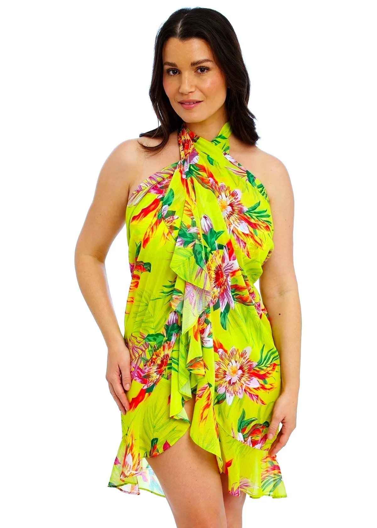 Пляжная юбка-саронг Фентези Кала Макарелла с яркими тропическим цветами на жёлтом фоне - Fantasie Cala Macarella Sarong 505291 Zest ZET / FS505291. Универсальная модель - можно носить как юбки и как сарафан, красивый многослойный крой с оборкой. Юбка с запахом на поясе, полностью раскрывается. Возможны разные варианты использования - обратите внимание на фотографии.