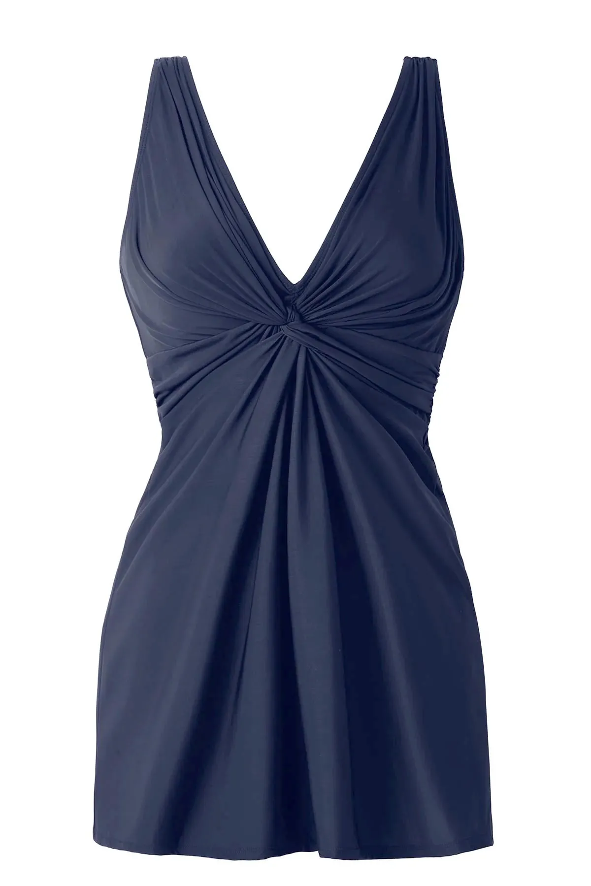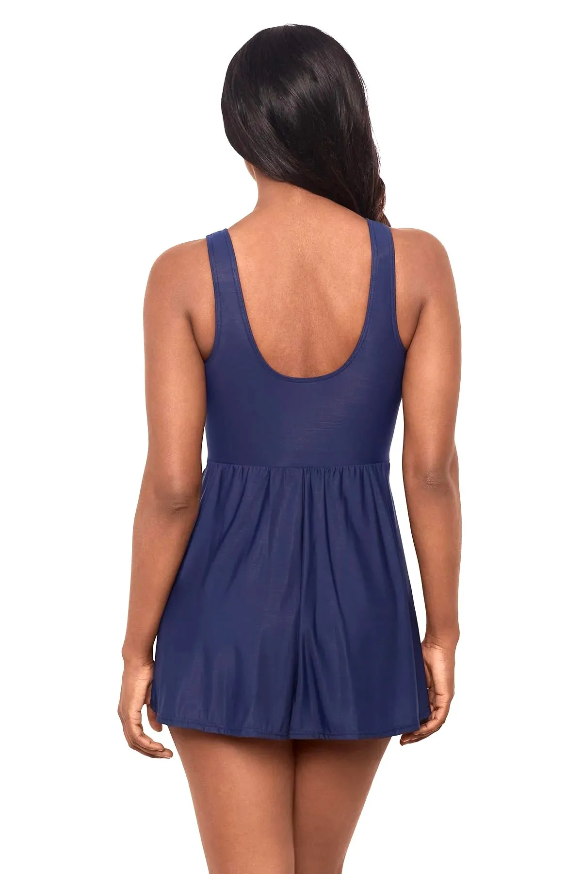 Купальное платье для большой груди Мираклсьют Мариас Солидз тёмно-синего цвета - Miraclesuit Marais Solids 6518635DD MDN midnight.Мягкая чашка без косточек. Красивая сборка-драпировка с центром между чашками. Складки ткани маскируют неровности силуэта и создают эффектный образ. Внутренний слой - с утягивающим эффектом за счет эластичных свойств ткани. Купальное платье - это классический слитный купальник, дополненный драпировкой-юбочкой из более легкого, но непрозрачного материала.