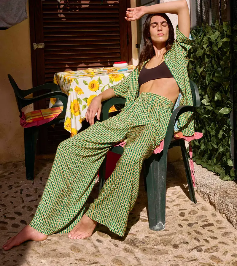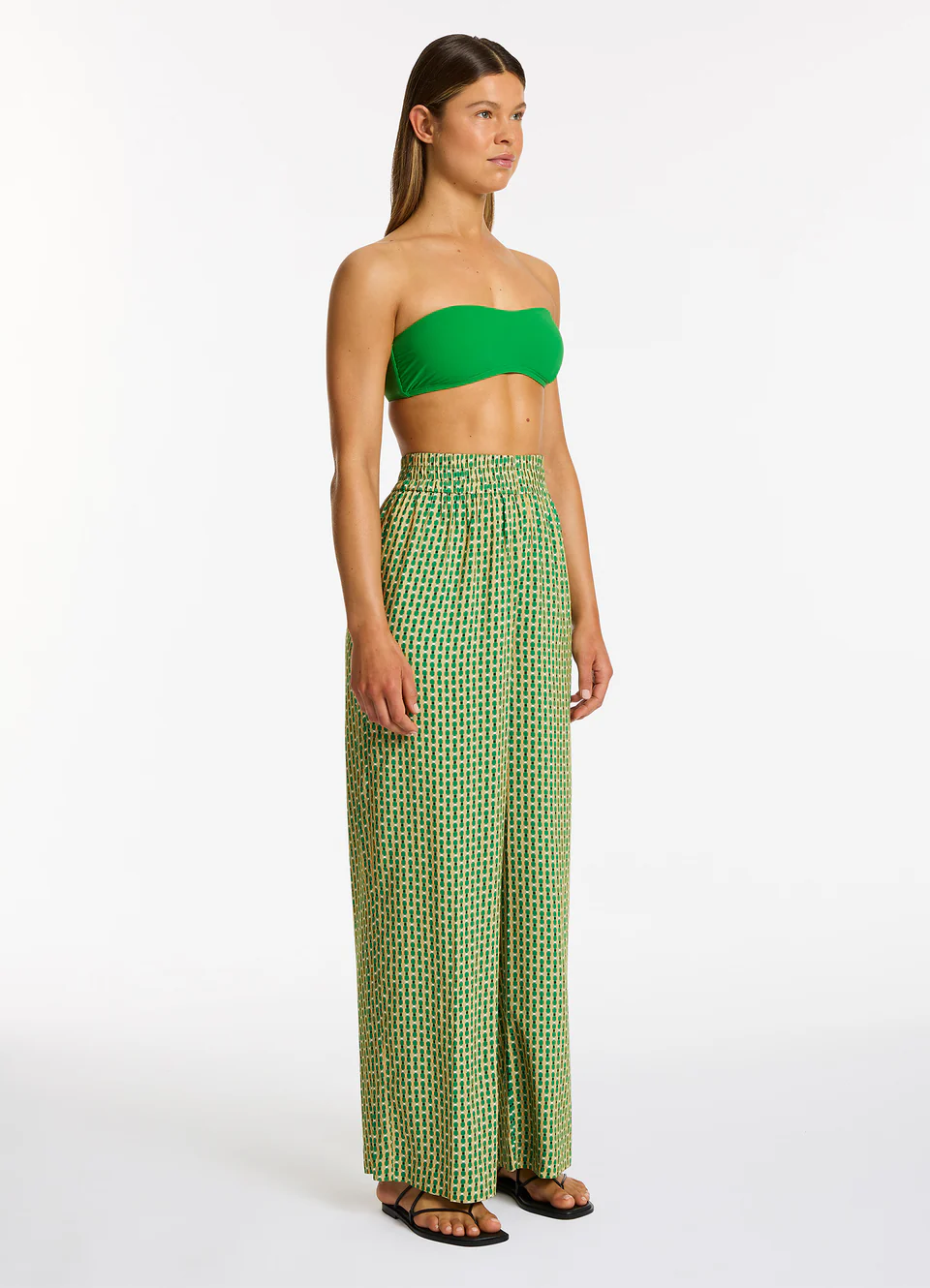 Лёгкие летние брюки-палаццо Джетс Флора с геометрическим принтом в оттенках зелёного - Jets Mattala Geo Wide Leg Pant - Flora J61380. Выполнены из лёгкого струящегося материала - 100% вискоза, текстильное плотно. Брюки на широком поясе-резинке с лёгкой сборкой у талии. По бокам - внутренние карманы.