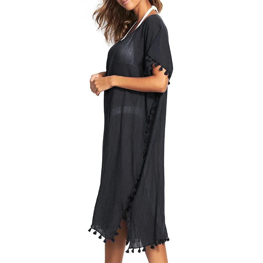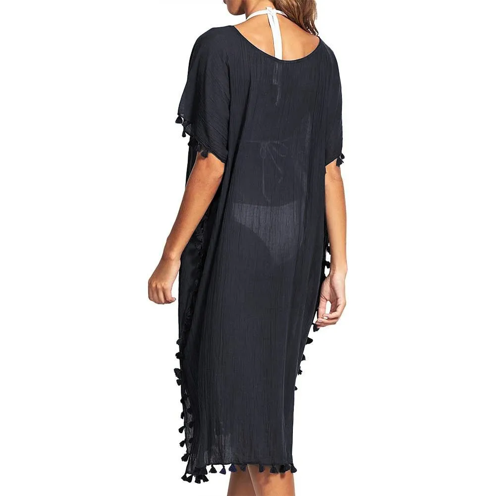 Кафтан-туника миди Сифолли Амнезия чёрного цвета - Seafolly BEACHEDIT Amnesia Kaftan 53638 black BLK. 100% хлопок, жатая фактура ткани. V-образная горловина с декоративными кисточками по краю всего изделия. Короткий рукав. Универсальный размер. Длина - до середины голени.
