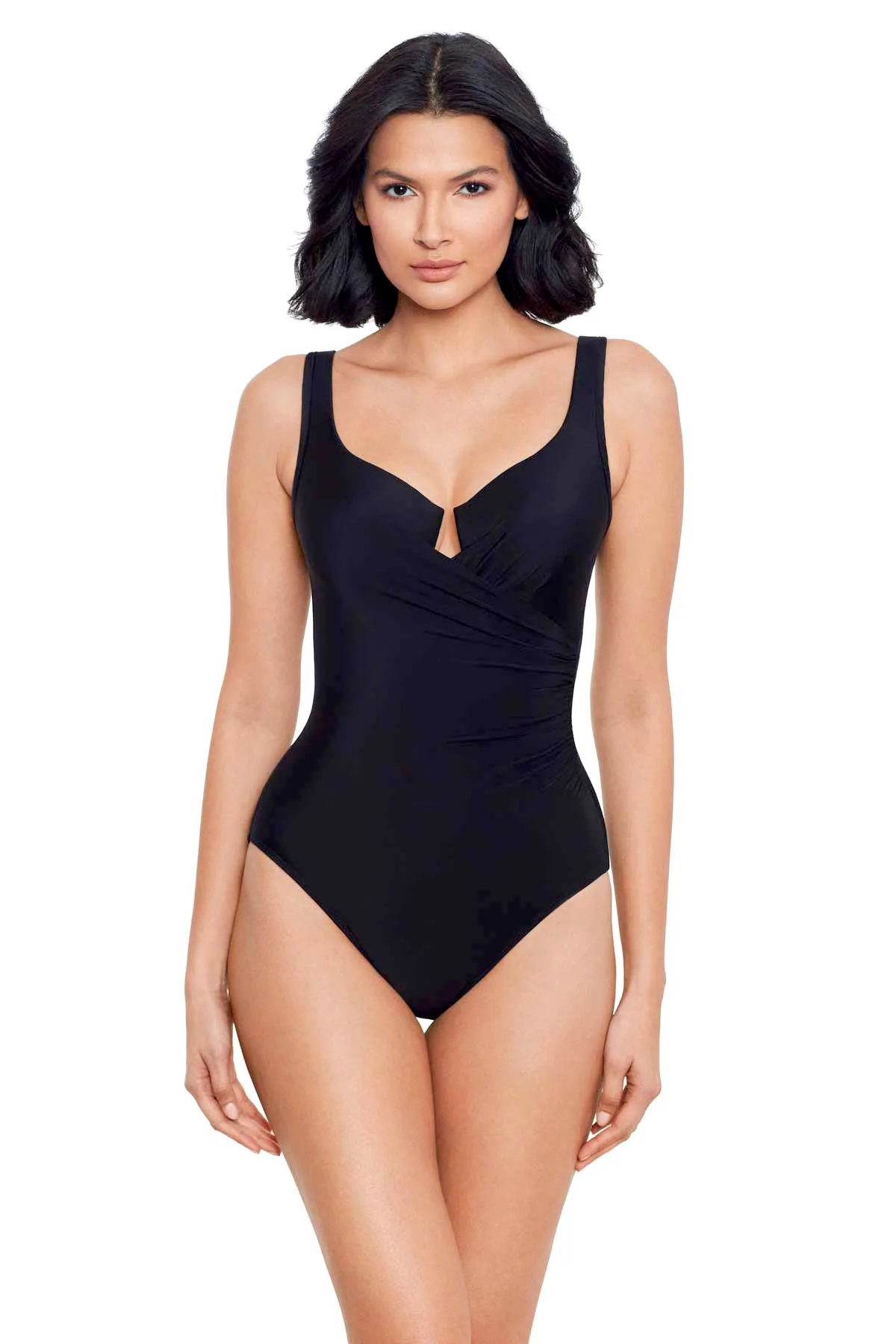 Утягивающий купальник Мираклсьют Маст Хэвз Эскейп чёрного цвета, однотонный - Miraclesuit Must Haves Escape 6516666 BLK. Специальная конструкция и особенности материала обеспечивают утяжку талии и бедер, контроль линии живота.