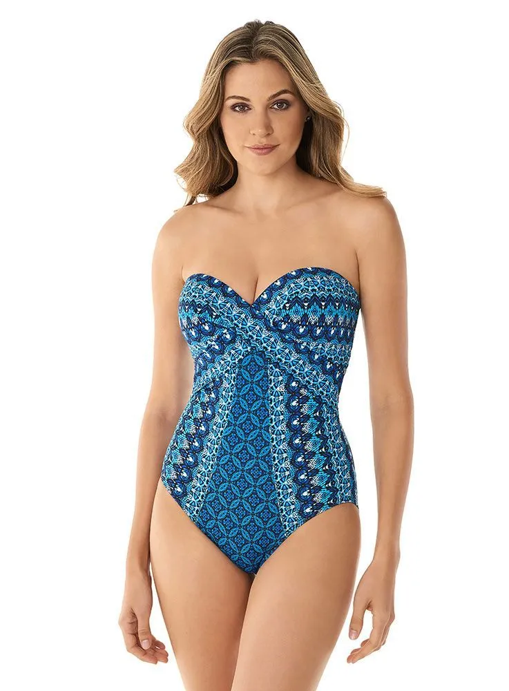 Утягивающий купальник Мираклсьют Мозаика c необычным геометрическим принтом в сине-голубых тонах - Miraclesuit Mosaica Seville bandeau one piece 6524197. Благодаря плотности ткани и особому крою купальник-бандо создает ровный, гладкий силуэт, сглаживая живот и бедра.
