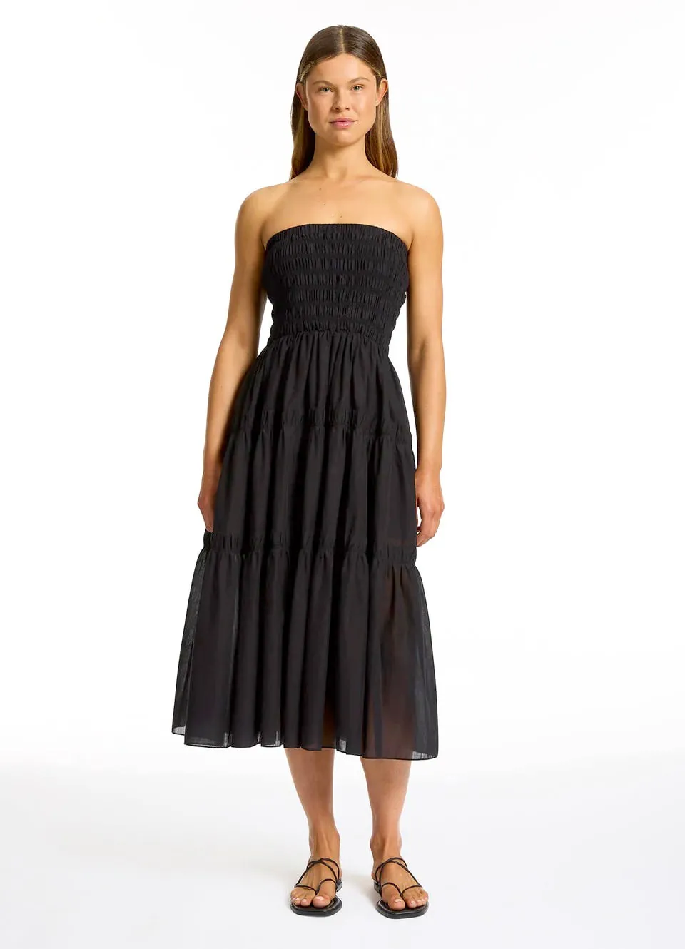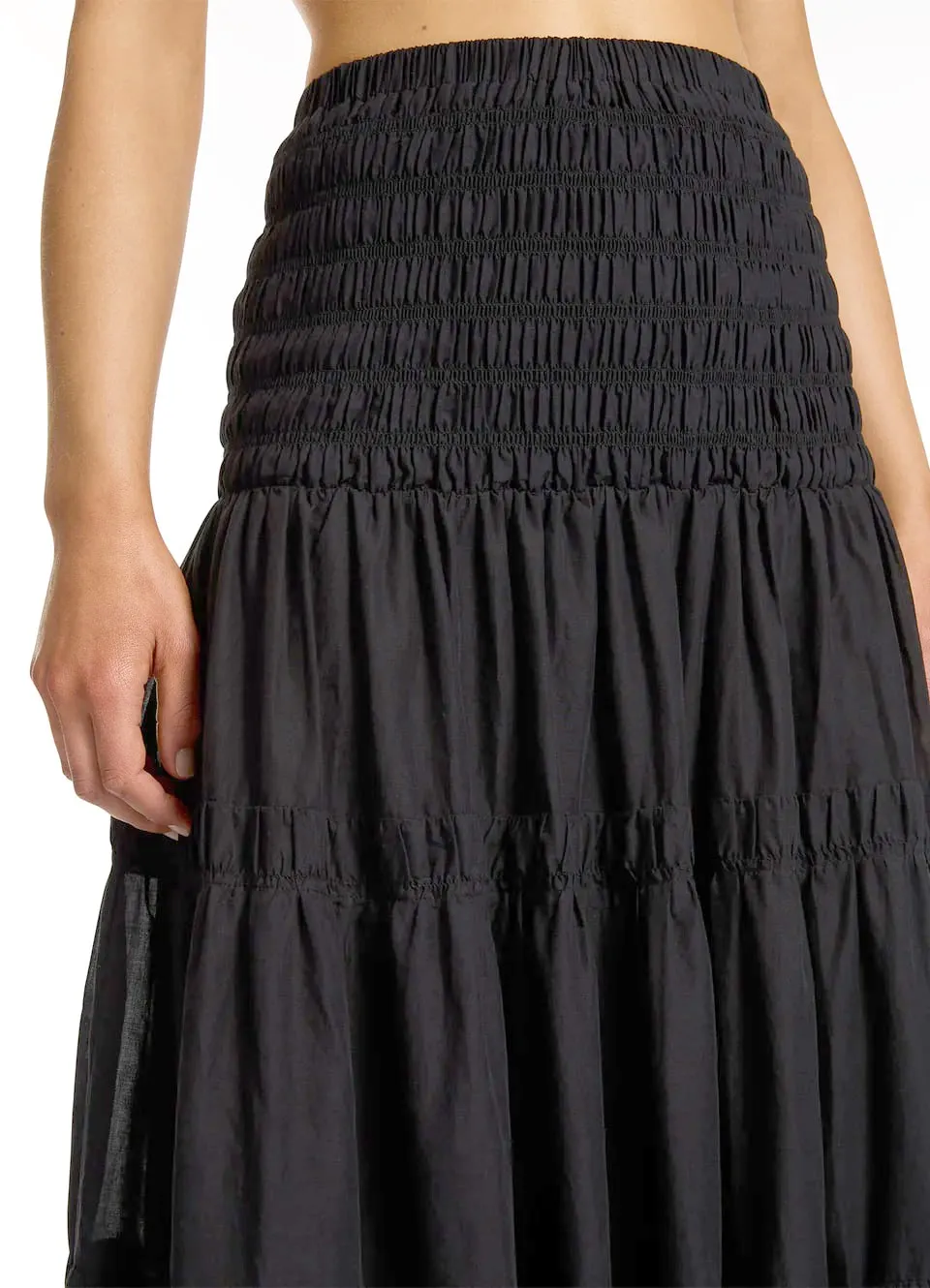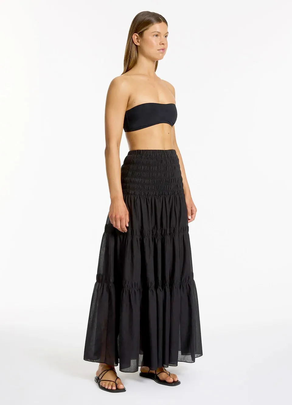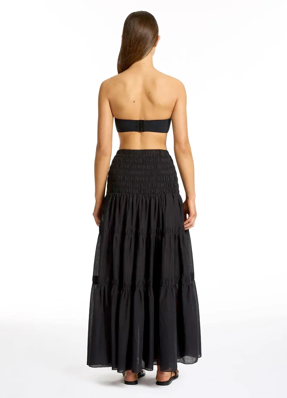 Платье-юбка Джетс Джетсет однотонного чёрного цвета - Jets Convertible Maxi Dress J61358. Модель-трансформер: можно носить как платье с лифом бандо или надевать как юбку. Широкий эластичный верх. Юбка воланами с лёгкой сборкой. Выполнено из 100% хлопка, текстильный материал.