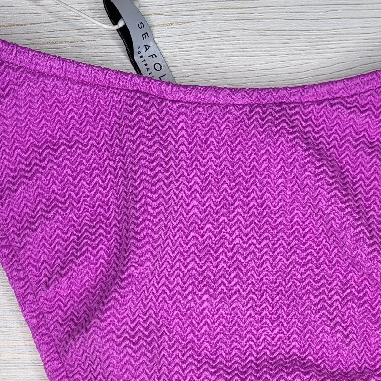 Важная информация от производителя: Ткань купальников Seafolly деликатная. Пожалуйста, избегайте контакта с украшениями, которые могут оставить зацепки, а так же с грубыми поверхностями.