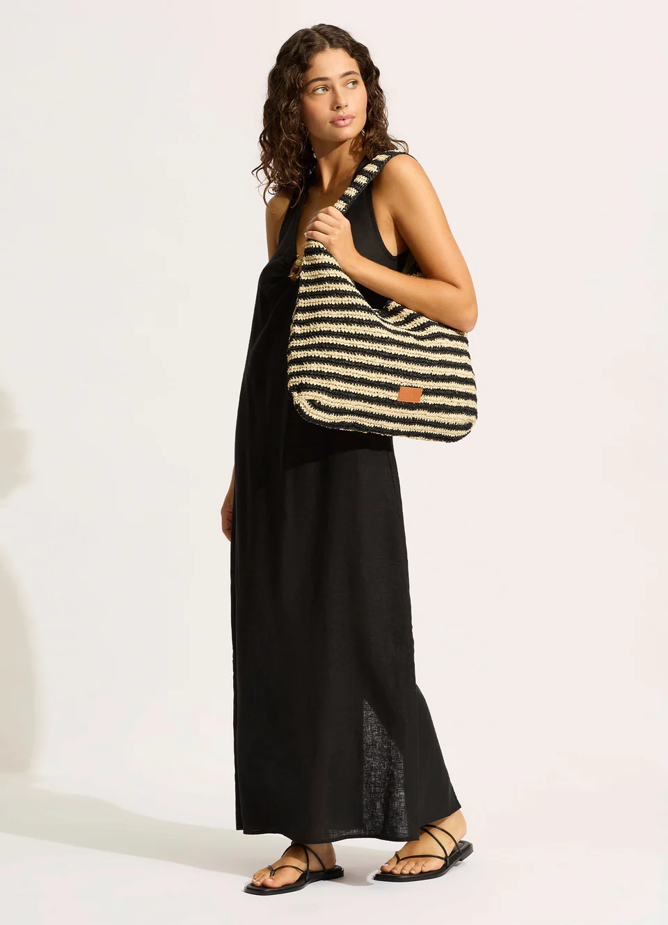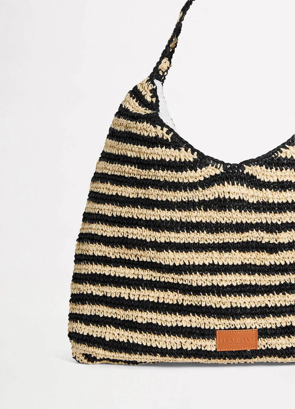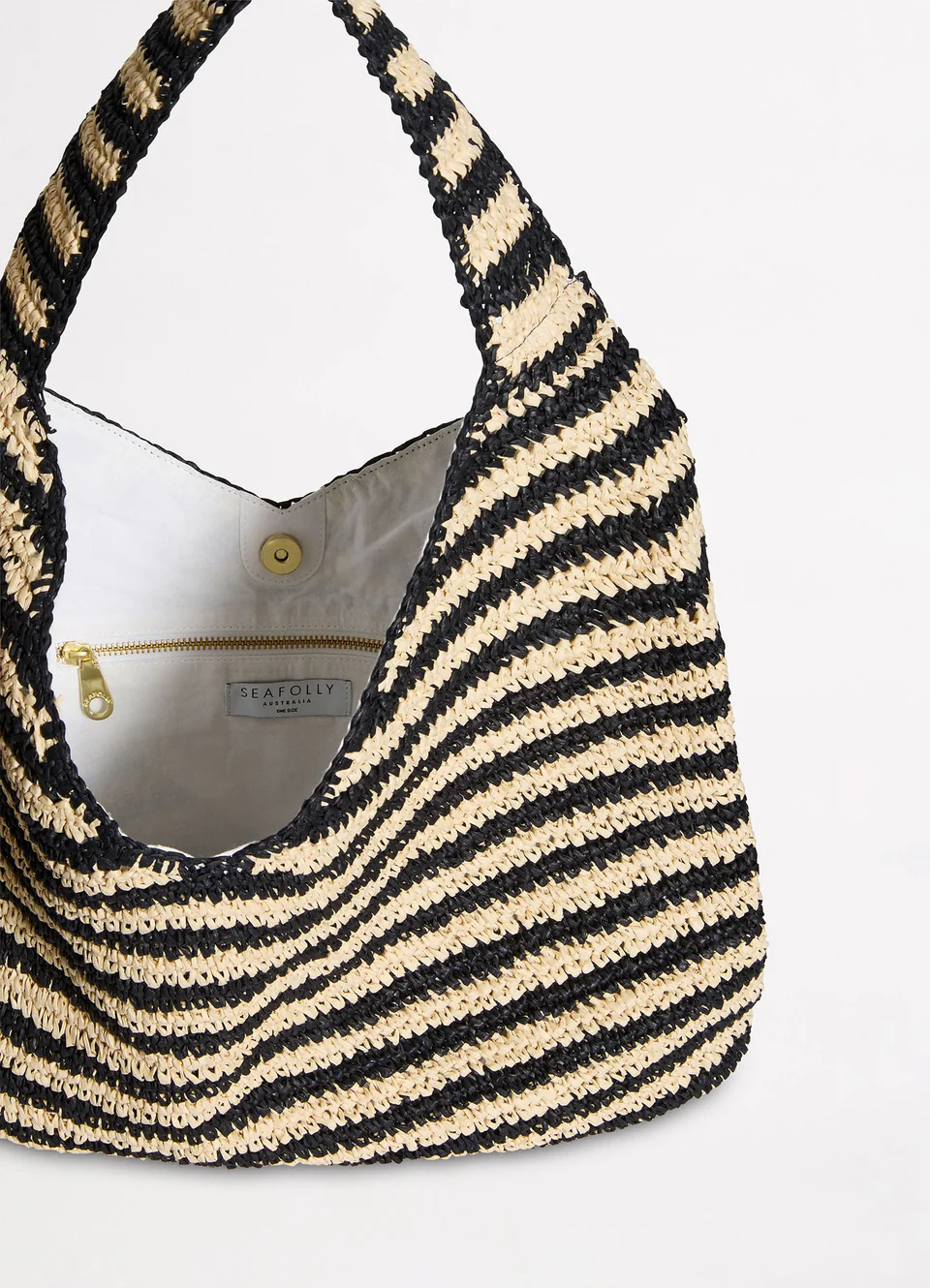 Плетёная сумка из рафии Сифолли в полоску - Seafolly Raffia Stripe Tote Bag - Natural / Black 72132-bg. Трапециевидная форма, двойные ручки, недлинные, надеваются на плечо. Застегивается клапаном с кнопкой. Фактура ажурная, похожая на вязку крючком. Черно-бежевая полоска. Длина сумки 36 см. Внутри - непрозрачная подкладка и карман на застежке-молнии. Сумка украшена фирменной эмблемой Seafolly Australia